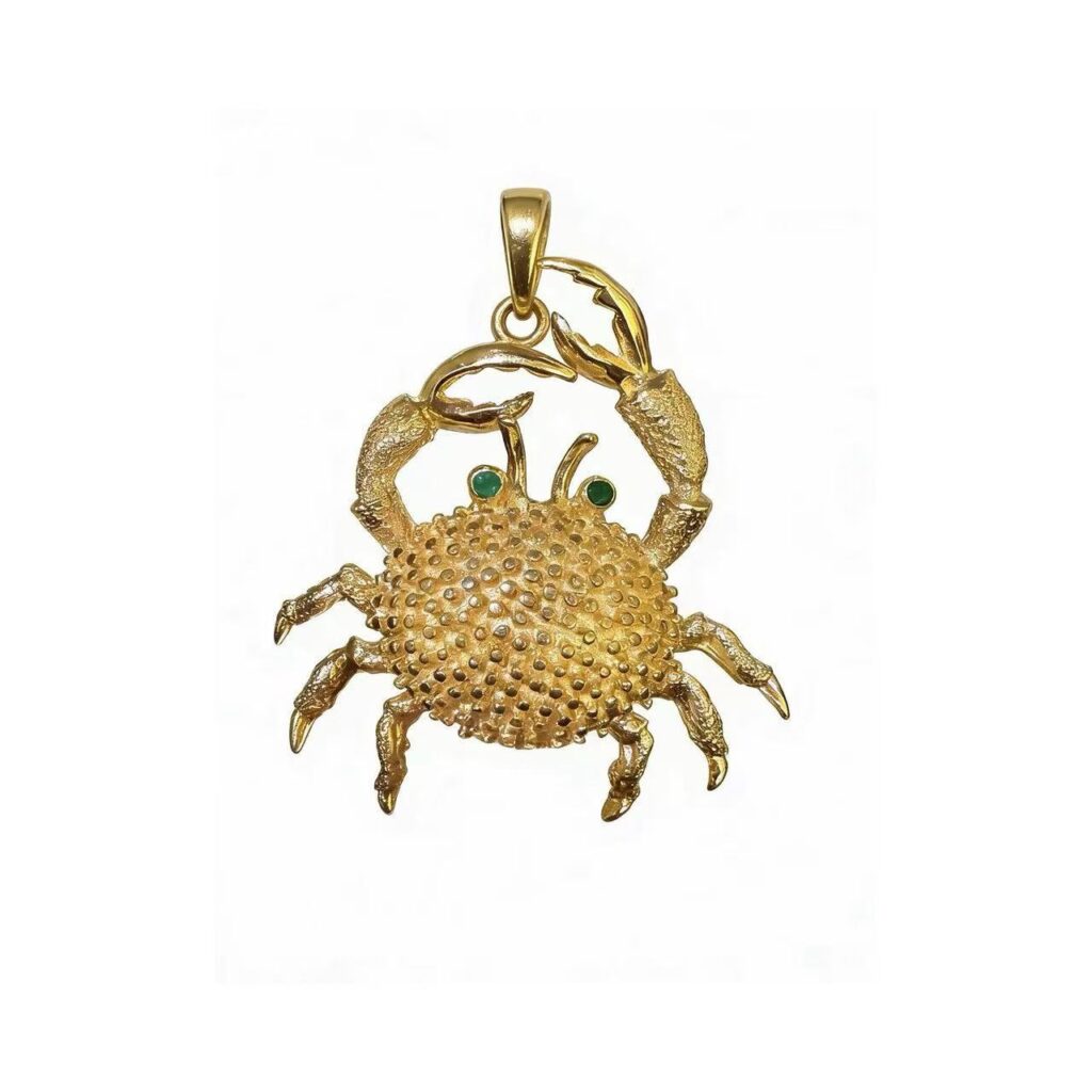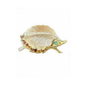 This brooch features a whimsical fish motif artfully crafted from polished gold. Its body mimics...