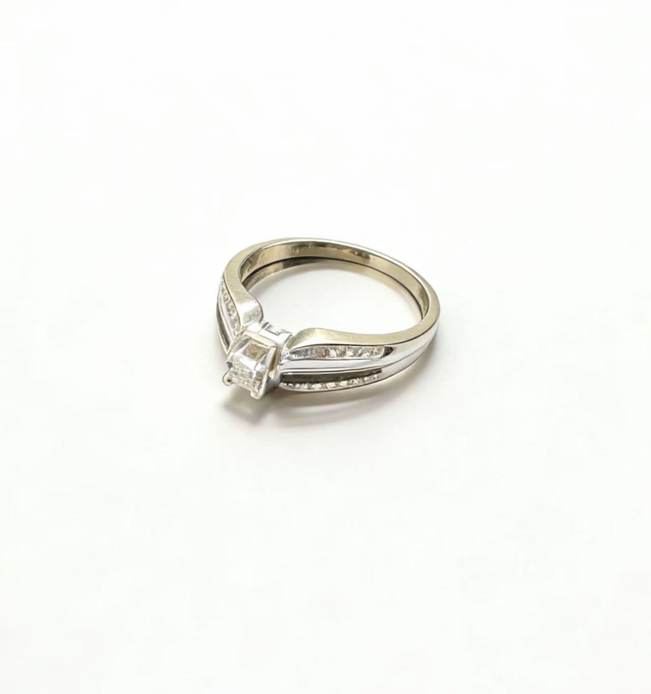 This 10K white gold diamond ring showcases a bold, modern design defined by its angular silhouette and layered band construction. A princess-cut diamond takes center stage, held in a sleek prong setting that emphasizes the stone’s geometric brilliance, while round brilliant-cut diamonds are pavé-set along the split shank for added sparkle and depth.