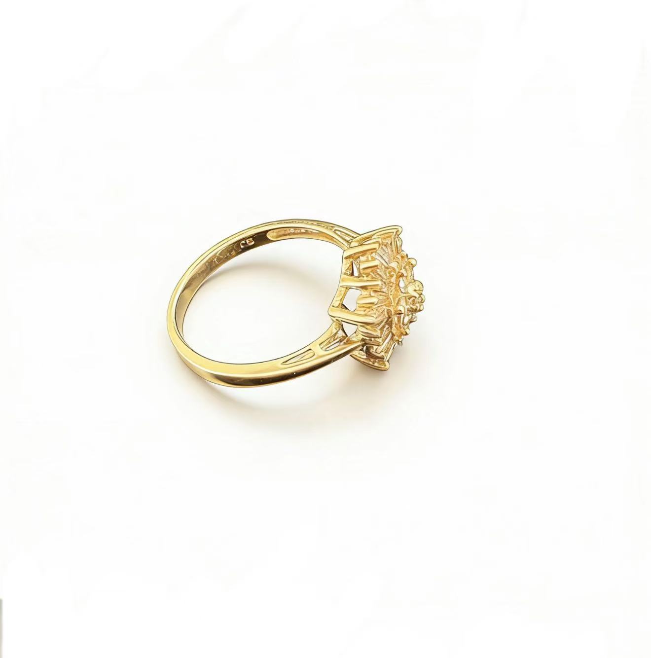 This dazzling 10K gold ring features a floral-inspired cluster of baguette and round-cut diamonds, set in a polished yellow gold band. The three-dimensional cluster design creates brilliant light reflection, delivering a bold yet elegant look that shines for both daily wear and special events. A timeless piece that blends classic diamond allure with modern floral styling.