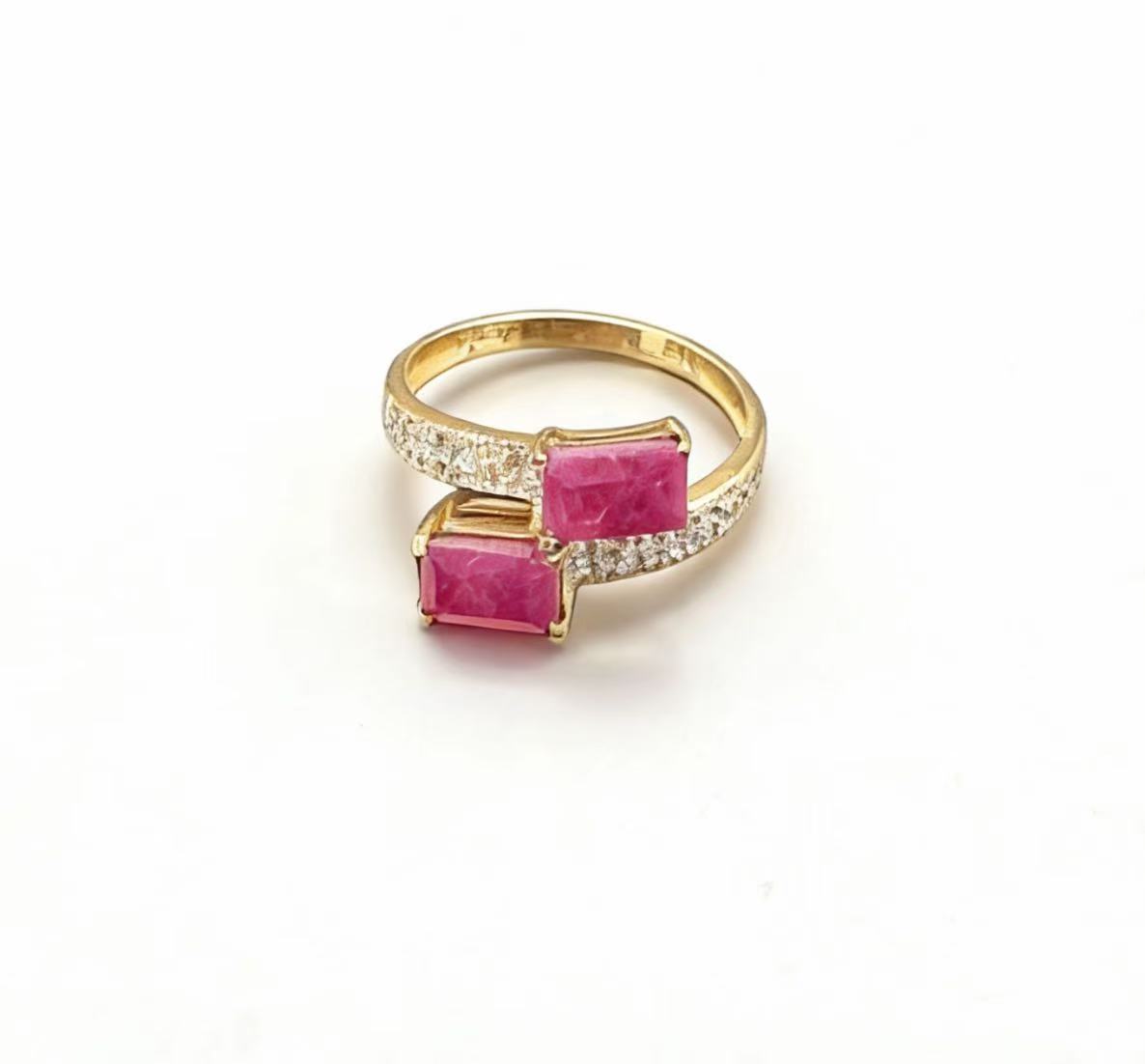 This 10K gold ruby ring features a contemporary bypass design that exudes modern elegance. Two cushion-cut natural rubies with vivid magenta hues take center stage, set in polished 10K gold prongs for a secure and striking hold. The intertwined 10K gold band is encrusted with sparkling round white topaz (or diamond simulants) along the shoulders, creating a dazzling contrast against the rich red of the rubies and the warm luster of the gold. The smooth, polished gold shank ensures comfortable everyday wear, while the asymmetric double-stone layout adds a bold, artistic touch to this piece. Perfect for those who favor unique, eye-catching jewelry that blends classic gemstone beauty with modern design sensibilities, this ring serves as a standout accessory for both casual and formal occasions.