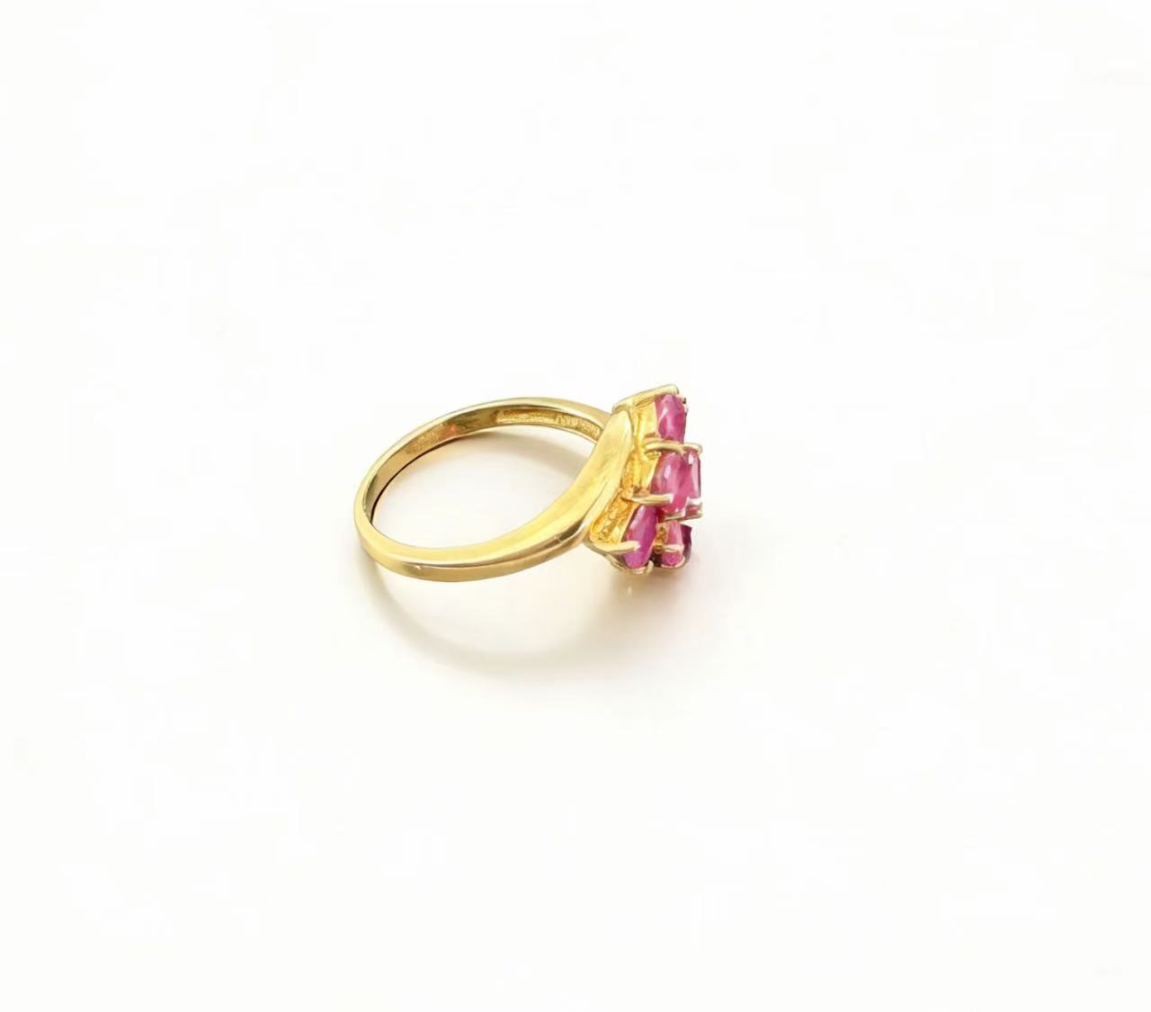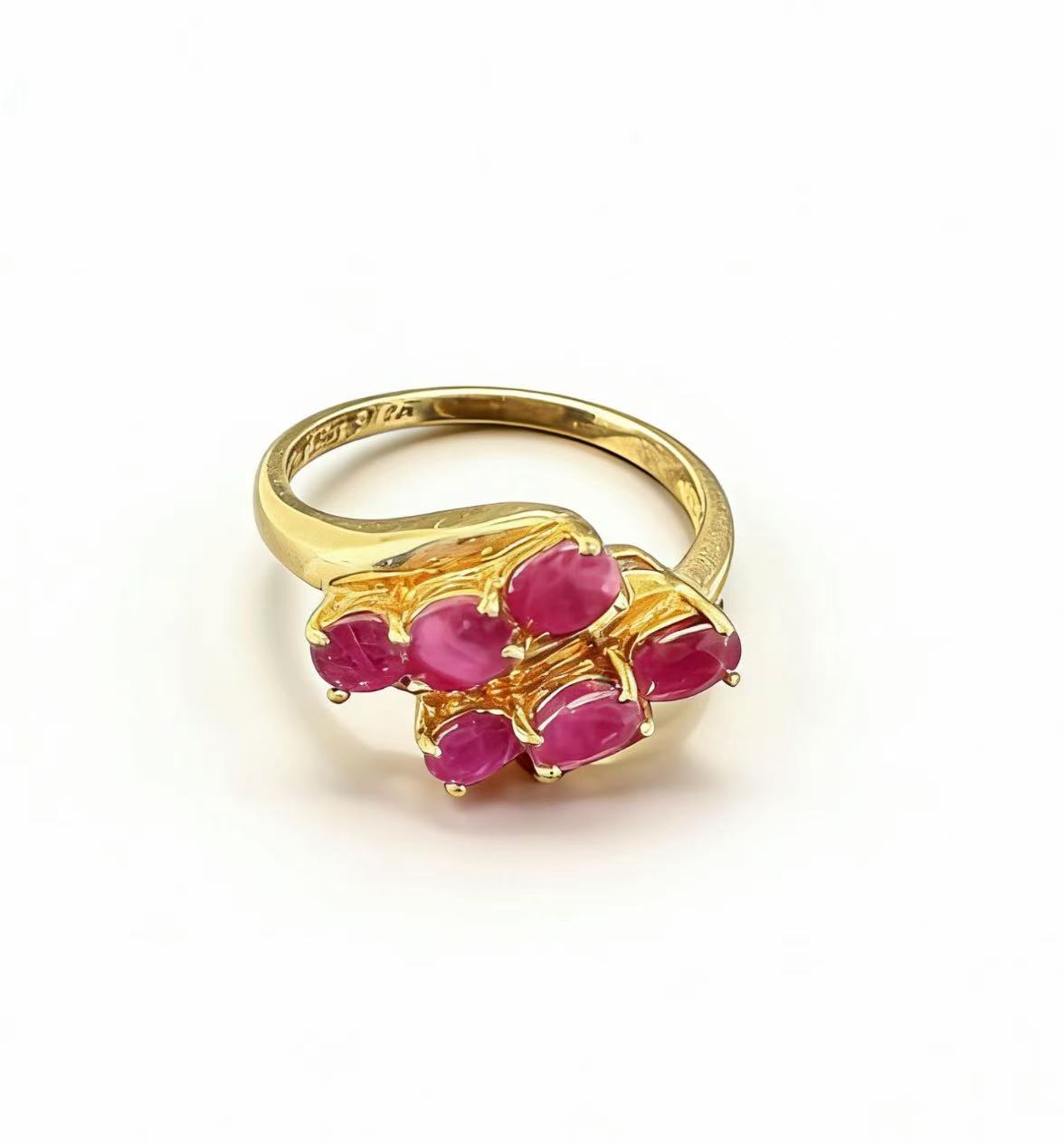 Crafted from lustrous 10K gold, this ring showcases a curated cluster of natural rubies with vivid magenta tones and smooth oval cuts. The organic, sculpted gold setting mimics a blooming flower, holding the gemstones in a delicate yet secure prong setting, while the contoured band ensures a comfortable fit. A timeless piece that merges artisanal craftsmanship with the timeless allure of rubies.