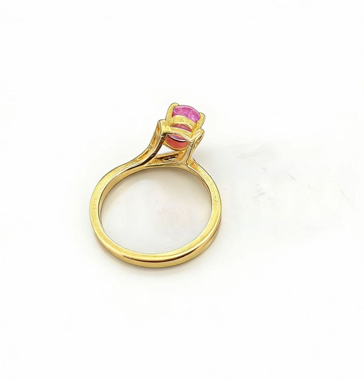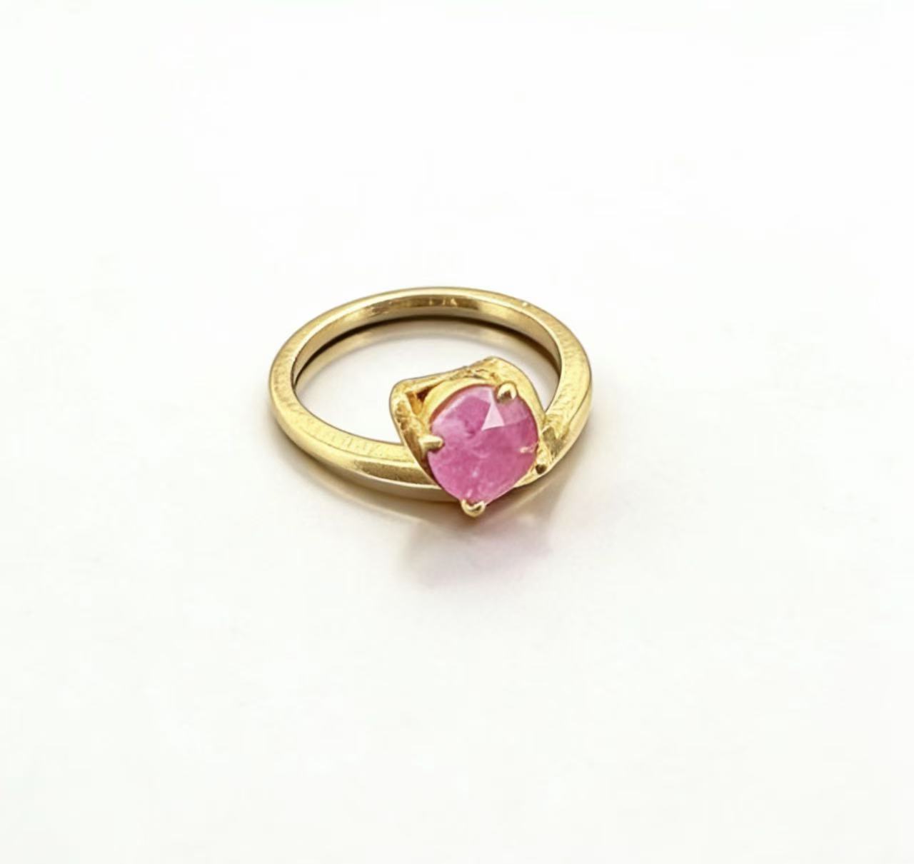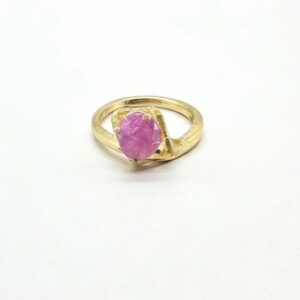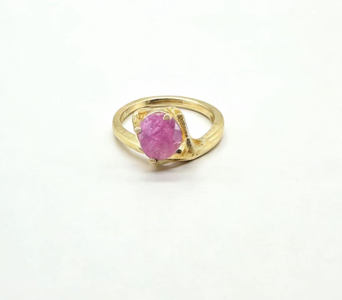 This 10K gold ring showcases a raw pink ruby centerstone in an organic gold prong setting. The uncut gem’s natural texture pairs with polished 10K gold for a unique blend of rustic charm and classic metallurgy, making it a standout piece for everyday wear or special occasions.
