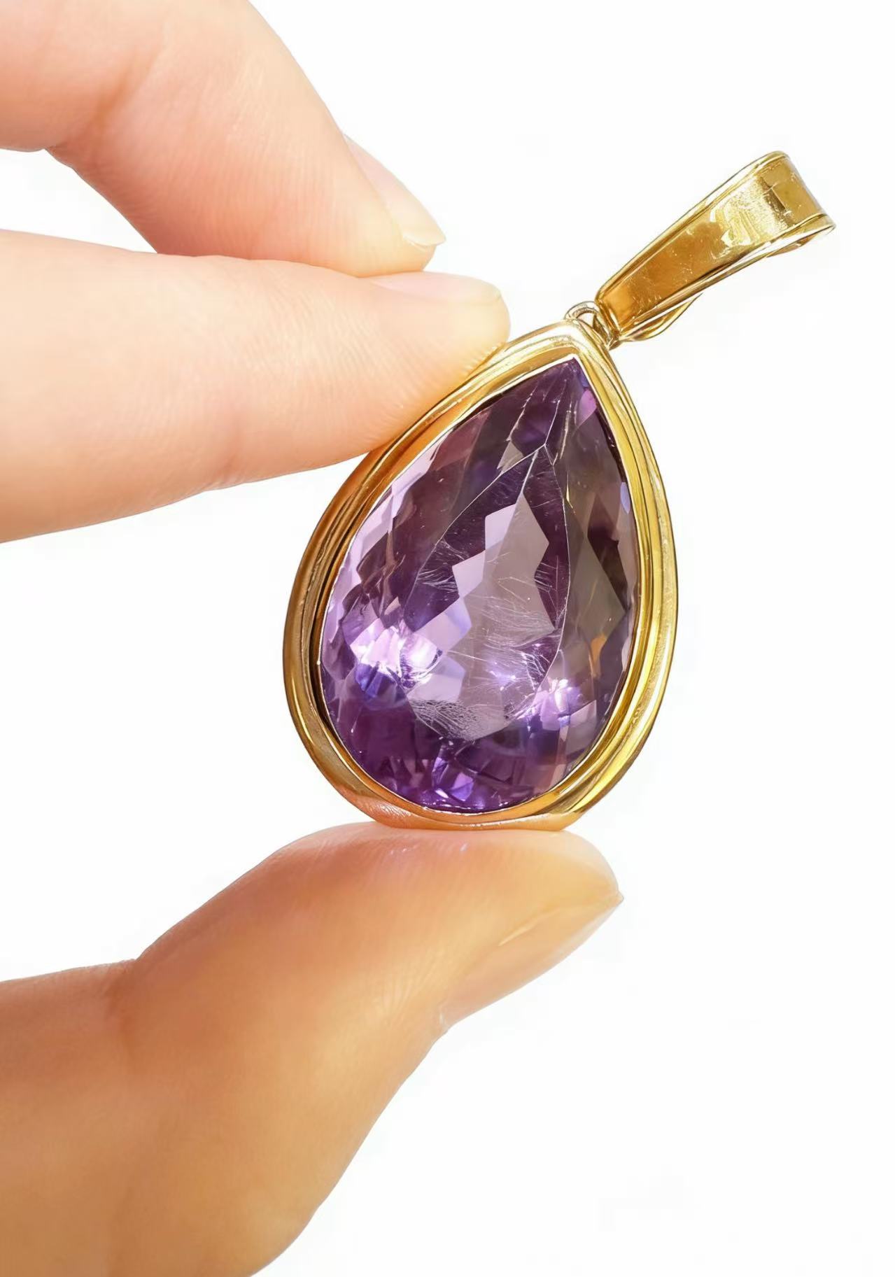 Crafted in polished 14k yellow gold, this pendant features a showstopping pear-cut amethyst as its sole centerpiece, boasting deep violet hues with brilliant faceting that catches light to reveal vivid purple fire and natural internal clarity.