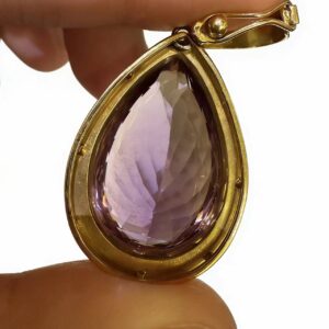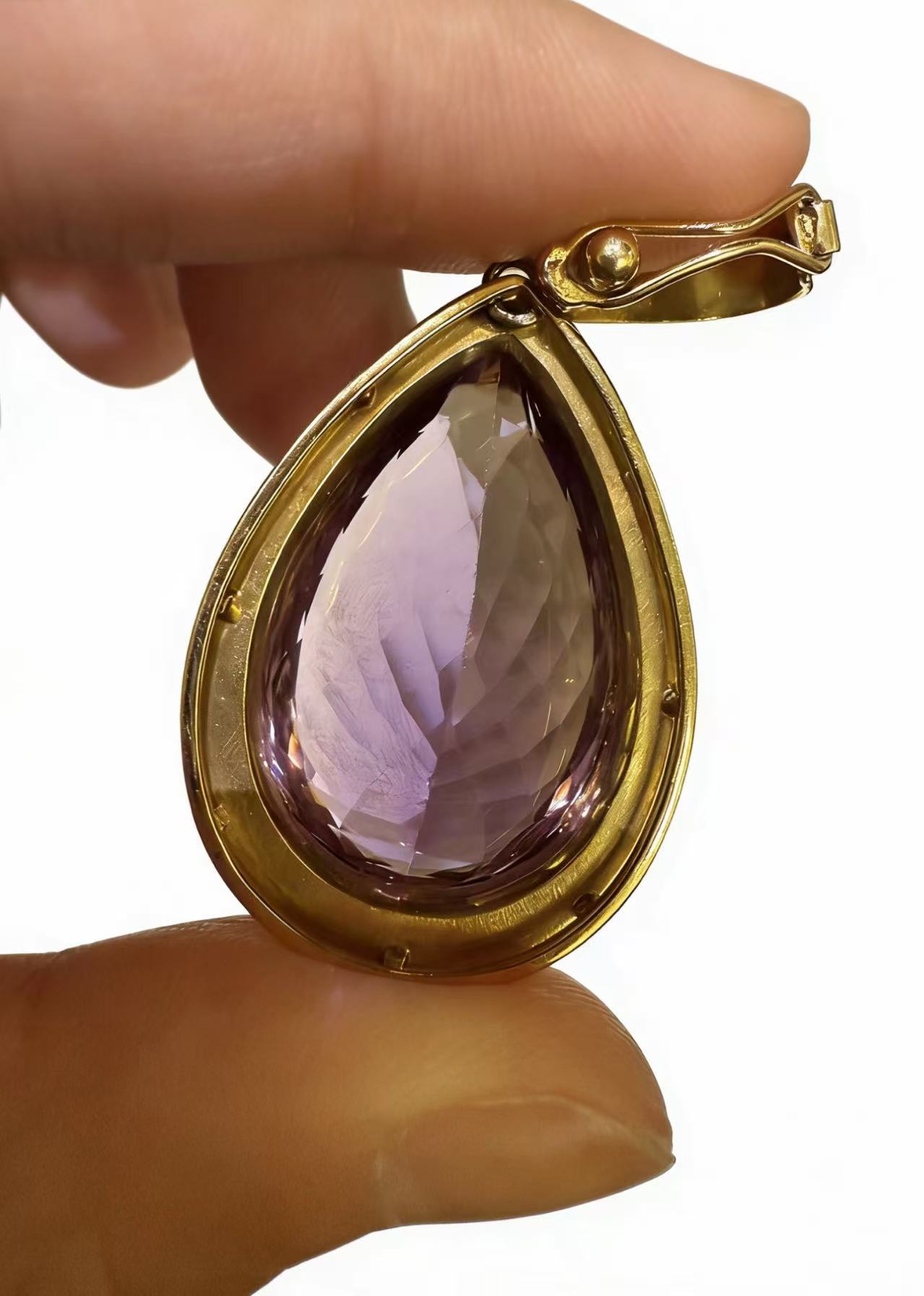 Crafted in polished 14k yellow gold, this pendant features a showstopping pear-cut amethyst as its sole centerpiece, boasting deep violet hues with brilliant faceting that catches light to reveal vivid purple fire and natural internal clarity. The gemstone is held in a sleek bezel setting that follows the organic teardrop shape of the amethyst, emphasizing its elongated silhouette while providing secure, streamlined hold. A smooth, substantial gold bail sits atop the pendant, designed for easy attachment to any chain and adding a touch of refined simplicity to the overall design. This solitaire-style piece marries the bold color of natural amethyst with the warm luster of 14k gold, offering a timeless, minimalist aesthetic that works equally well for everyday wear or as a sophisticated statement accessory. Meticulously crafted, it highlights the unique beauty of the pear-cut amethyst and the enduring quality of solid 14k gold.