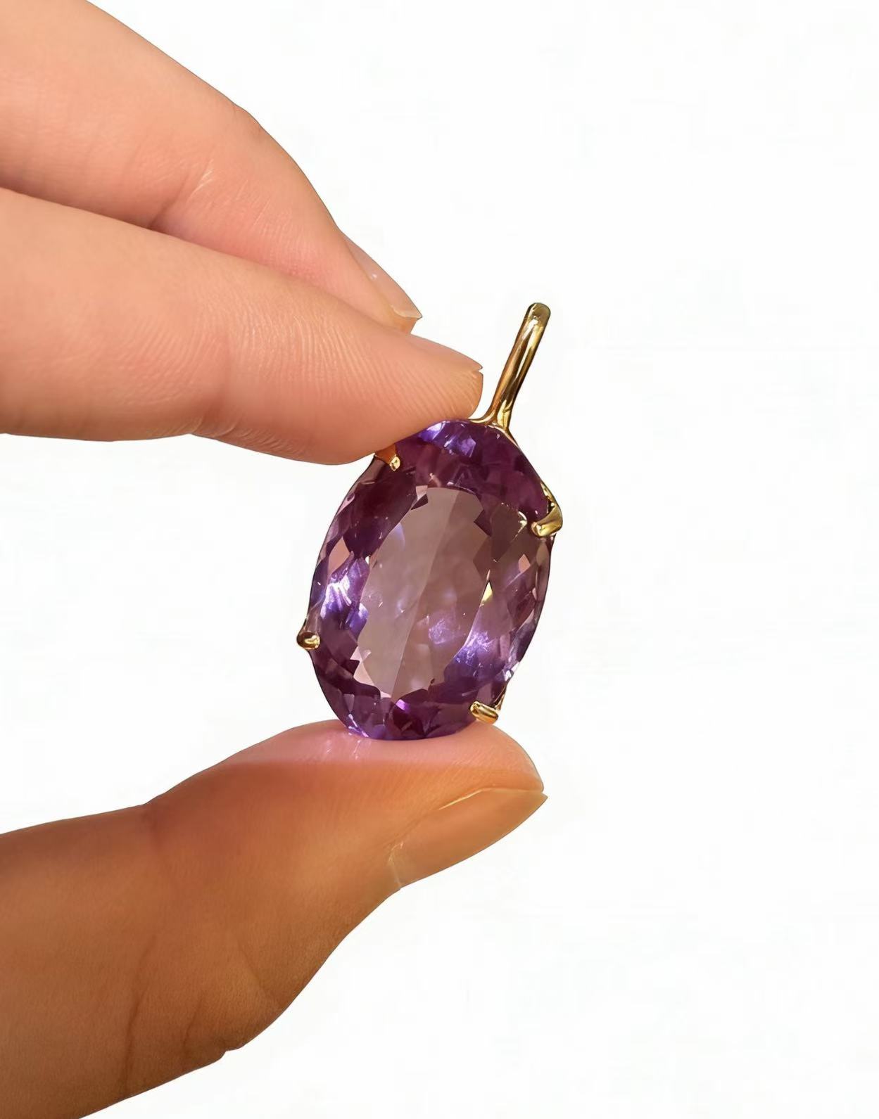This 14K yellow gold amethyst pendant is a masterclass in minimalist luxury, designed to let the natural beauty of the gemstone take center stage. The focal point is a large oval-cut amethyst with a deep violet hue and precision faceting that catches light to produce a mesmerizing play of color—each facet is engineered to enhance the stone’s inherent vibrancy, avoiding over-ornamentation for a clean, sophisticated look.
