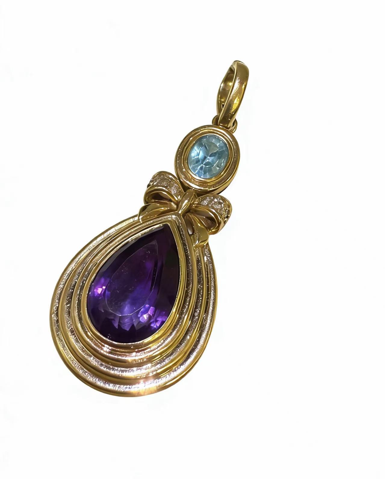 At the heart of the design lies a large pear-cut amethyst, its deep violet hue radiating rich, regal color with every facet catch of light—amethyst is renowned for its association with calm and clarity, adding a meaningful touch to the piece. Above it, a round Swiss blue topaz in a bezel setting delivers a striking cool-toned contrast, its sky-blue sparkle complementing the amethyst’s warmth perfectly.