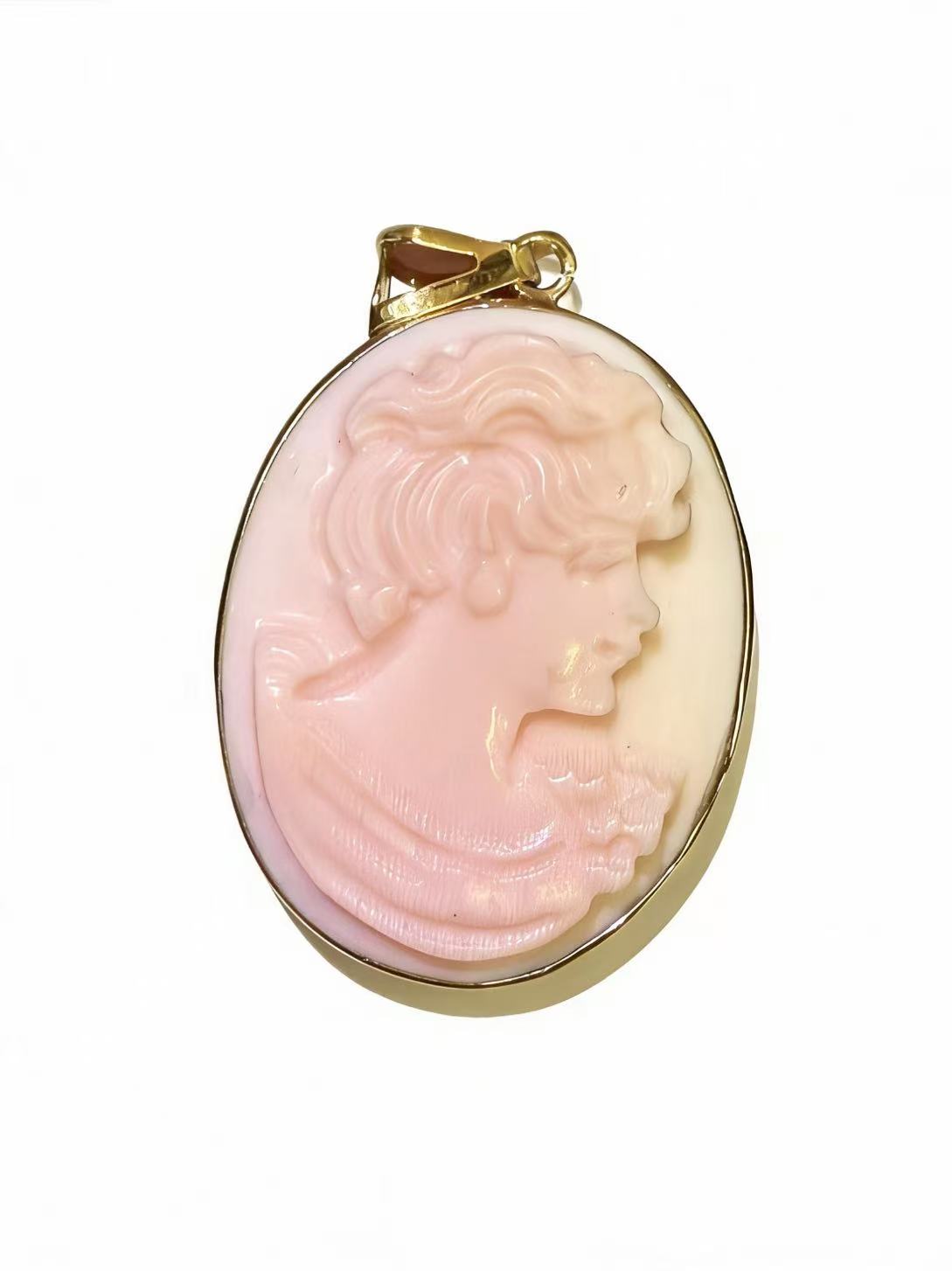 The first pendant showcases an oval shell cameo carved from natural sardonyx shell, with a warm peach-and-cream color gradient that brings depth to the classical maiden profile. Her cascading, intricately detailed curls and soft facial features are rendered with masterful precision—each swirl of hair and contour of the face is hand-carved to highlight the shell’s natural layering.