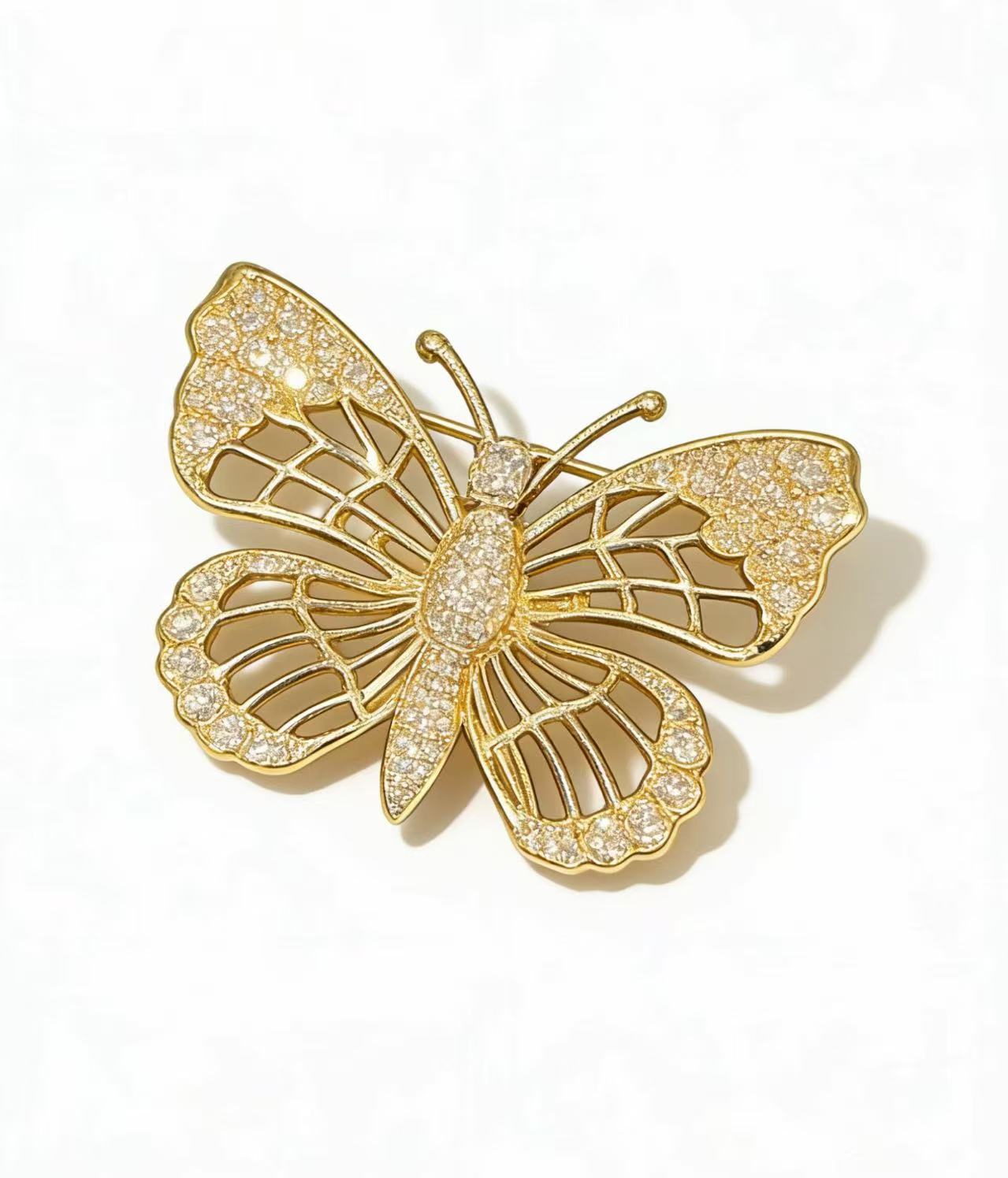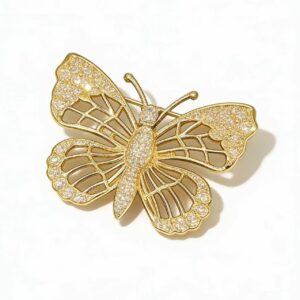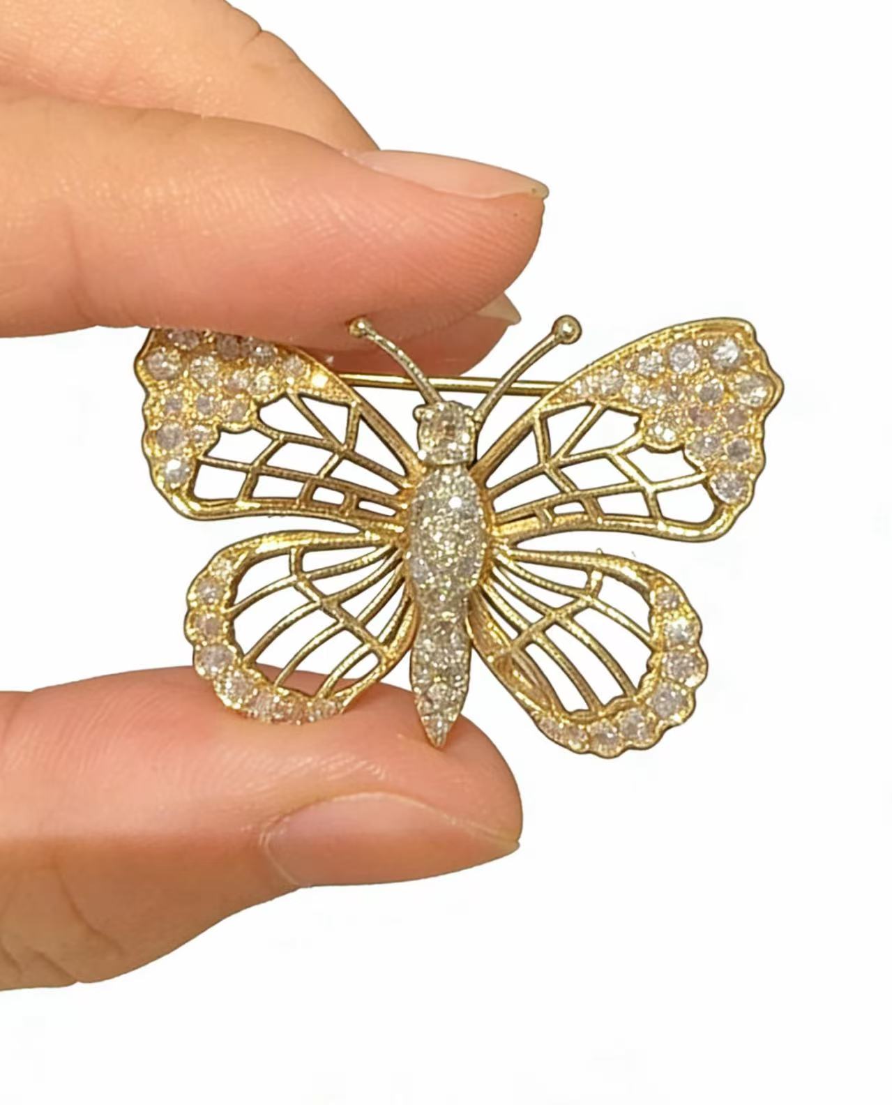 Crafted in solid 14K gold, this stunning butterfly brooch showcases masterful openwork metalcraft that captures the ethereal beauty of butterfly wings. The brooch is adorned with round brilliant-cut diamonds pavé-set along the butterfly’s body and wing borders, delivering a dazzling sparkle with every movement. The delicate gold filigree lattice adds depth and airiness to the design, while the classic butterfly symbolizes transformation and beauty. A refined piece of jewelry art, it is perfect for collectors of diamond-encrusted vintage brooches or anyone seeking a sophisticated statement accessory.