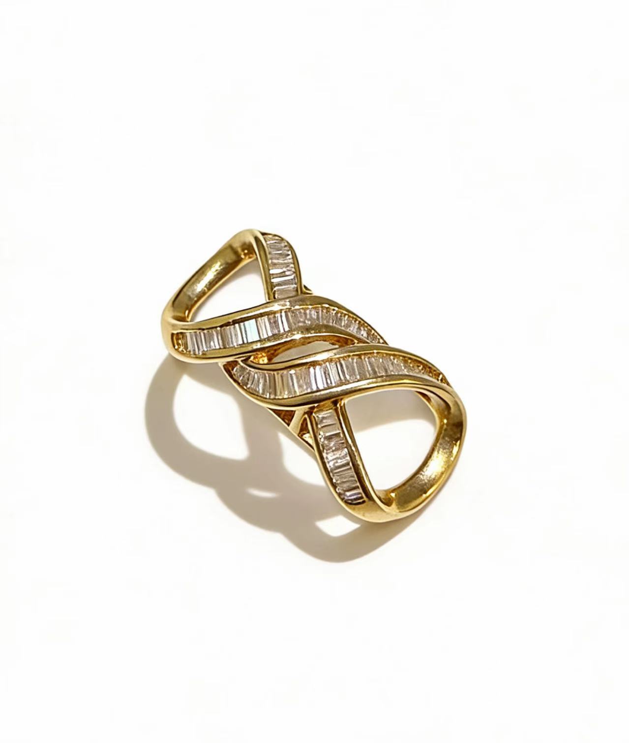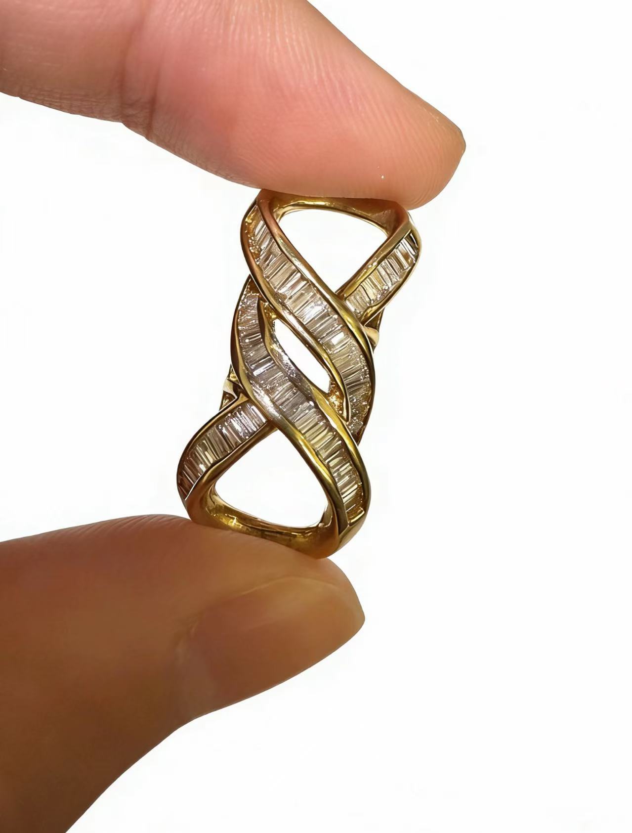 This exquisite 14K gold pendant reimagines modern elegance with its fluid intertwined design and sparkling baguette diamond accents.