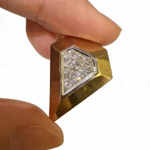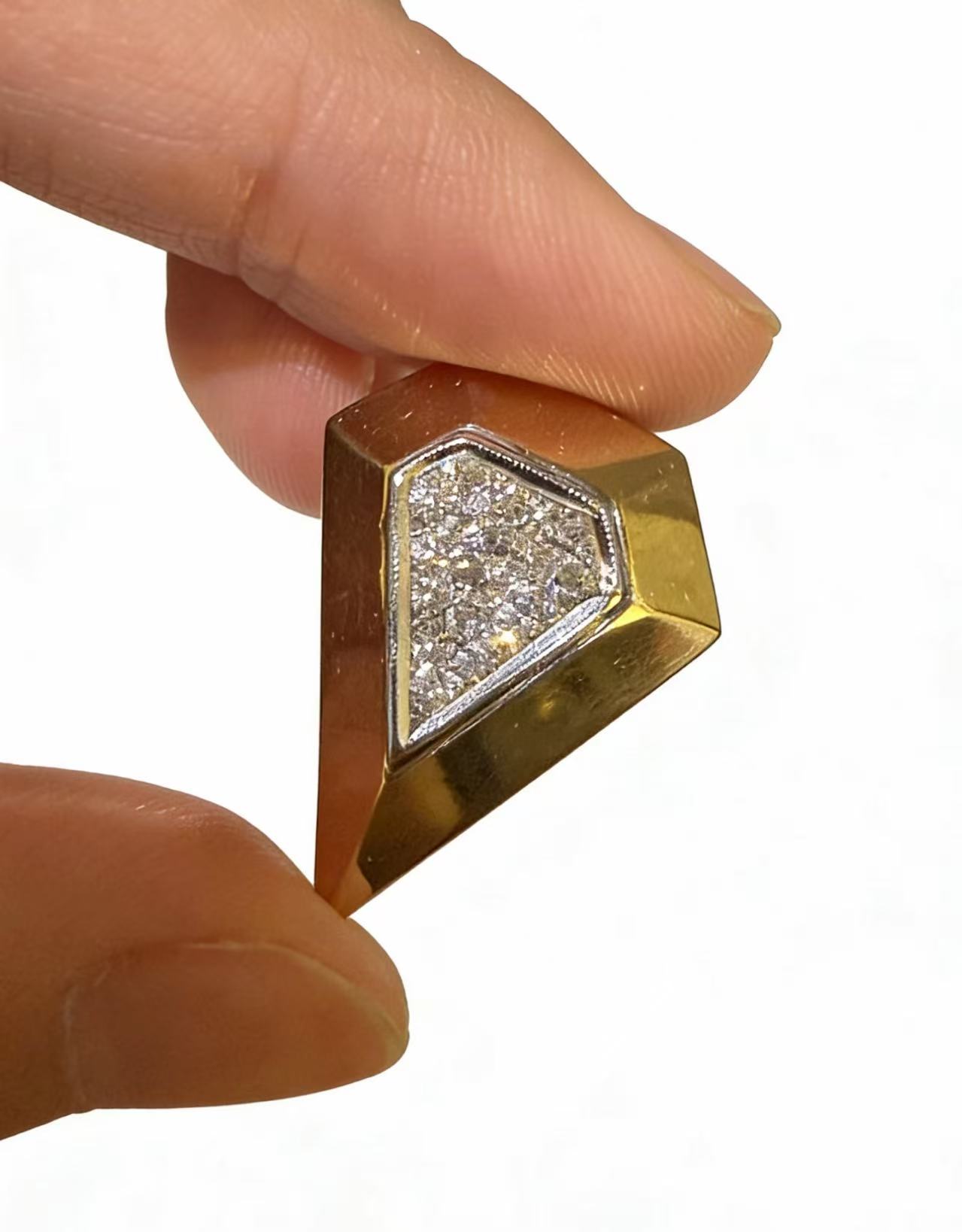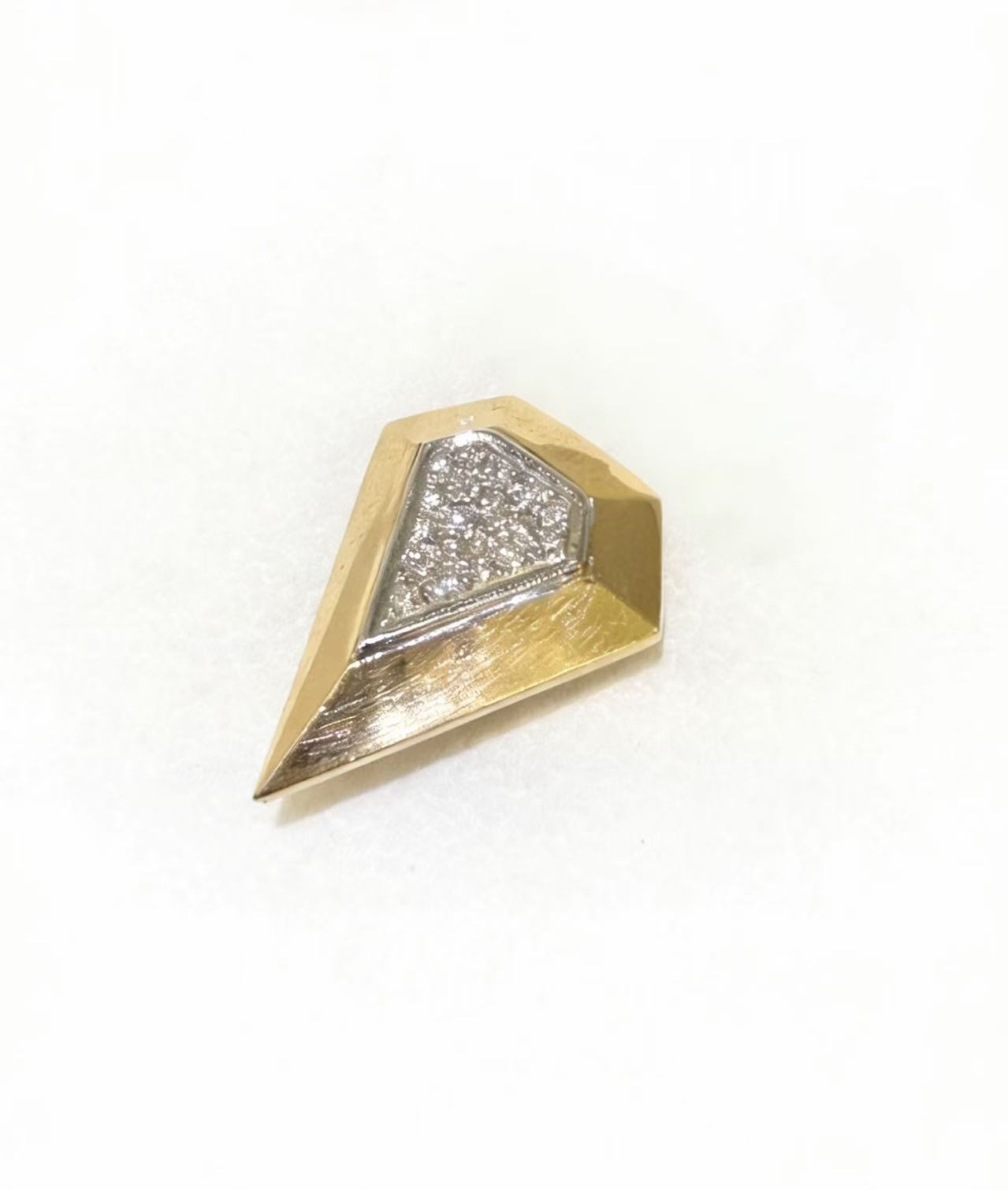 This striking 14K gold pendant redefines modern luxury with its bold geometric silhouette and intricate diamond detailing. Crafted in polished 14K gold, the pendant features a sharp, faceted kite-shaped design with angular edges and a three-dimensional structure that creates dynamic light play from every angle. At the center of the geometric frame, a recessed panel is encrusted with micro-pavé round brilliant diamonds, set in contrasting white gold to highlight the stones’ sparkle against the warm 14K gold backdrop. The diamond pavé is precision-set to fill the panel seamlessly, while the 14K gold surfaces blend smooth polished finishes with subtle brushed texture on the lower facet, adding tactile depth to the piece.