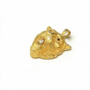 At the center of the tiger’s maw sits a brilliant round-cut diamond, held in a minimal bezel setting that lets the gem’s sparkle take center stage against the warm gold; tiny red gemstone accents (likely rubies) adorn the tiger’s eyes, adding a piercing, lifelike intensity to the design. The pendant’s 3D construction gives it depth and dimension, with every angle revealing new details of the tiger’s musculature and facial structure—crafted to mimic the natural anatomy of the big cat with remarkable precision.