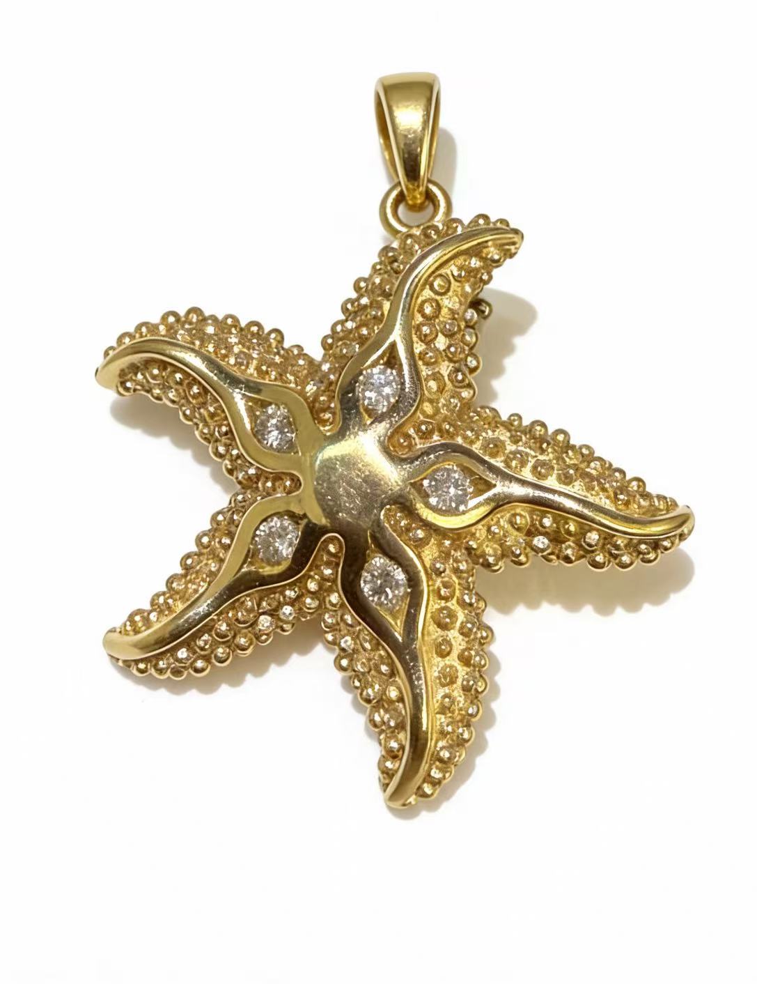 Crafted in polished 14K gold, the pendant captures the organic, flowing silhouette of a starfish with remarkable detail—its textured, beaded edges mimic the delicate texture of sea star arms, while the curved contours bring a sense of movement and life to the design. At the heart of the starfish, sparkling round-cut diamonds are pavé-set to catch the light from every angle, adding a brilliant contrast to the warm gold tone.