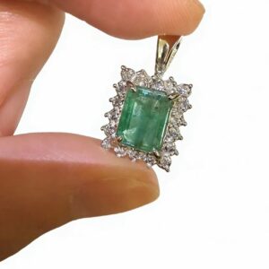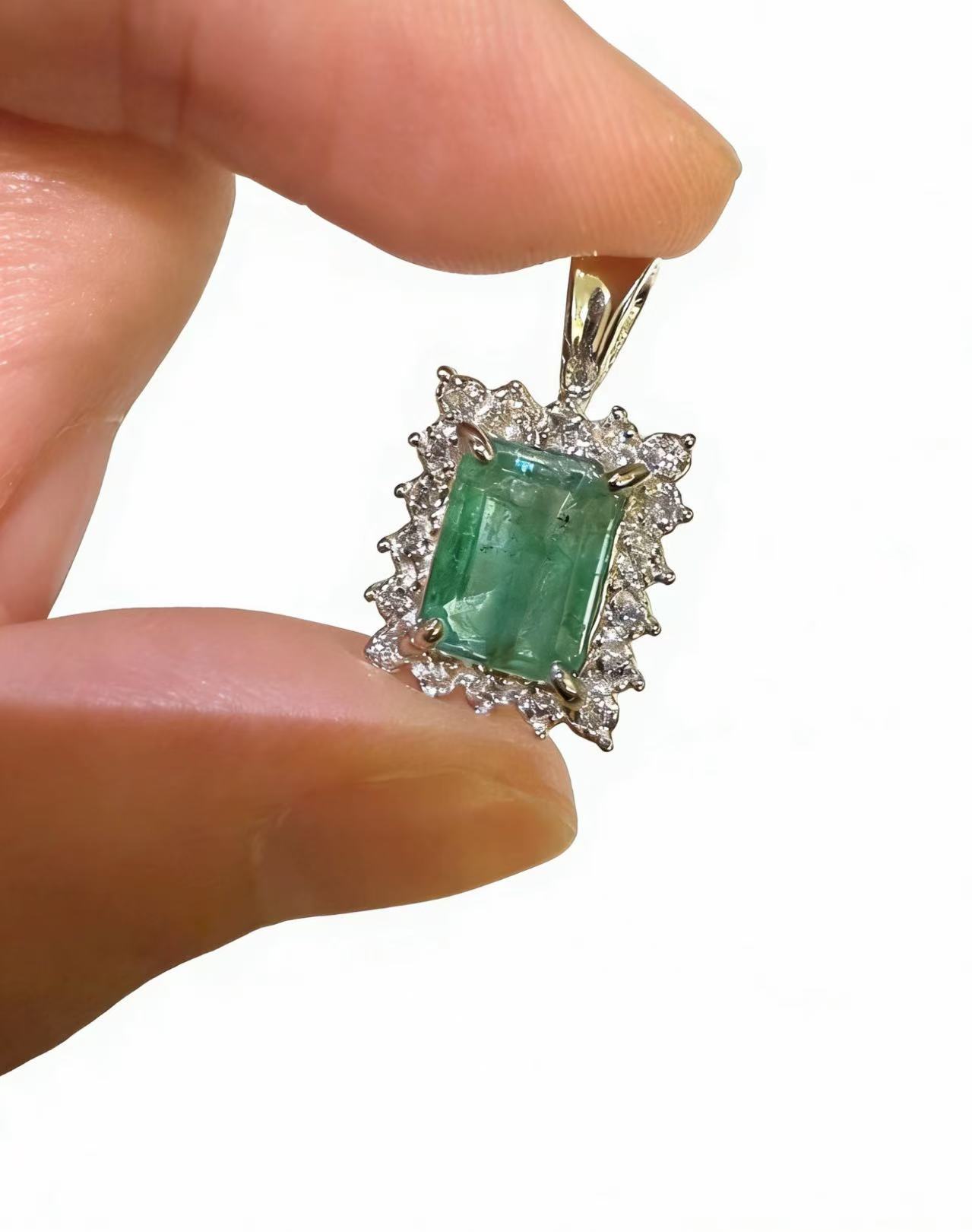 This striking 14K white gold pendant redefines timeless elegance with its bold emerald centerpiece and intricate diamond halo design. At the heart of the piece sits a vivid emerald cut emerald, selected for its deep, lush green hue and exceptional clarity—showcasing the stone’s natural beauty through a classic rectangular faceting pattern that maximizes light reflection. Encircling the emerald is a scalloped halo of round, brilliant-cut diamonds, set in polished 14K white gold prongs that create a dazzling frame, amplifying the emerald’s color and adding unparalleled sparkle. The 14K white gold setting features a sleek, minimalist basket construction that elevates the gemstones without overwhelming them, while the smooth, tapered bail ensures effortless pairing with any chain (from delicate cable chains to substantial curb styles). Crafted in solid 14K white gold for lasting durability and a cool, luminous finish, this pendant balances sophisticated geometry with the organic allure of the emerald. It is a versatile statement piece—equally suited for formal events when worn solo, or layered with other gold jewelry for a modern everyday look. Each gemstone is hand-set to ensure precision, making this pendant a luxurious addition to any fine jewelry collection and a meaningful heirloom for years to come.