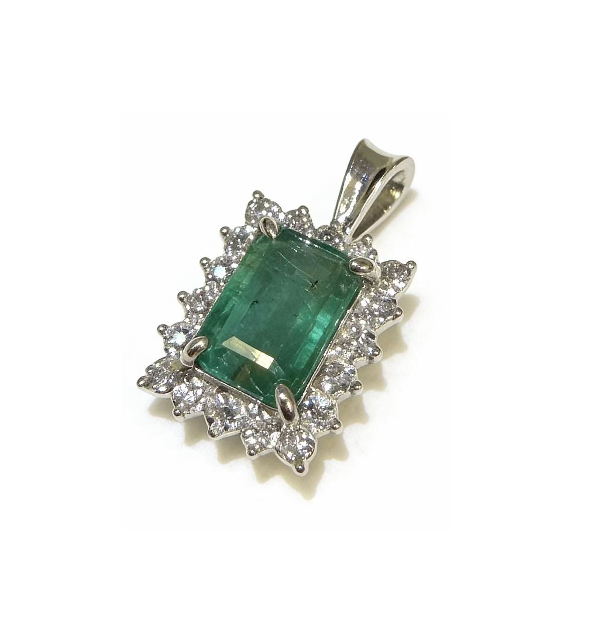This striking 14K white gold pendant redefines timeless elegance with its bold emerald centerpiece and intricate diamond halo design.