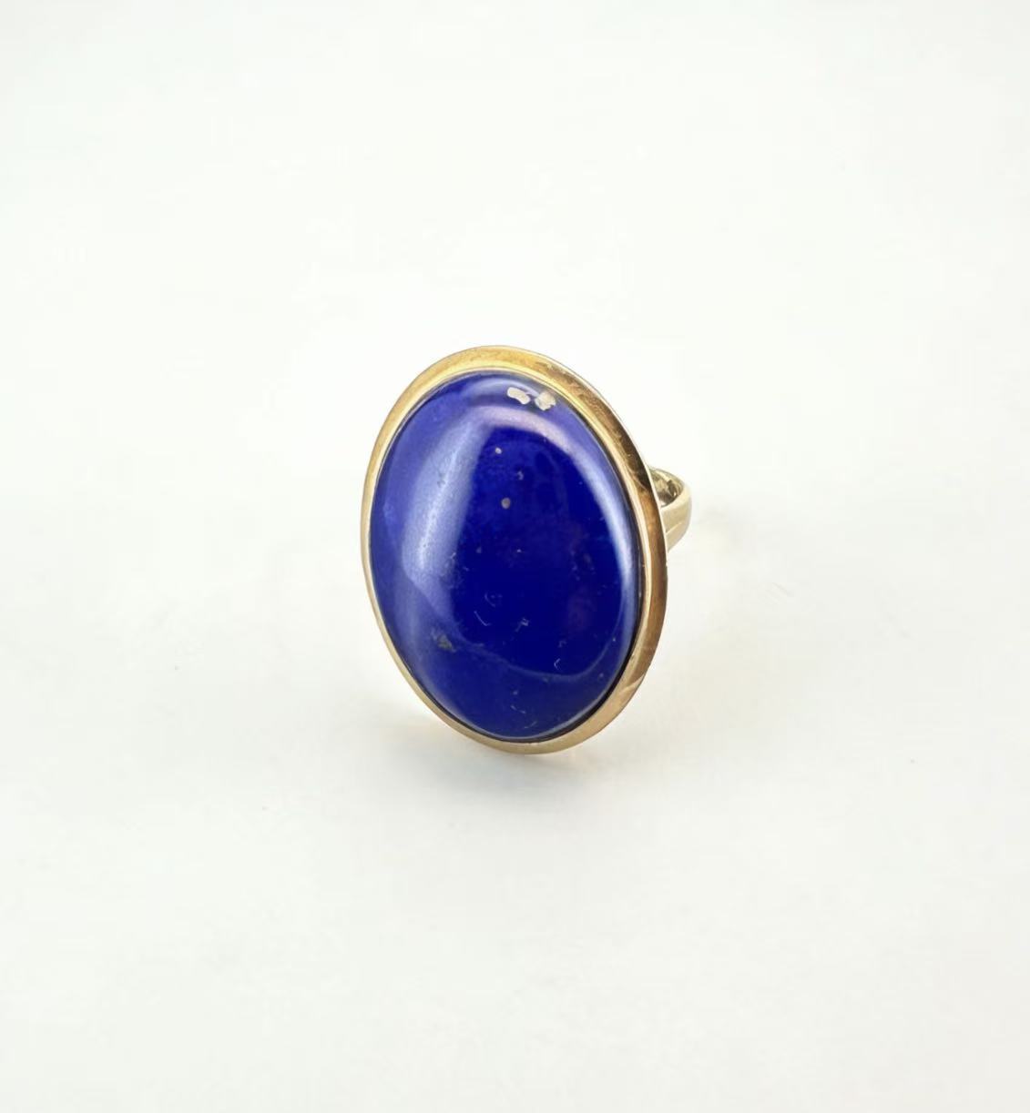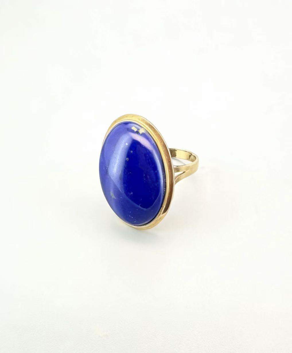 Crafted in warm 14K gold, this vintage-inspired lapis lazuli ring showcases a generously sized oval lapis lazuli cabochon with deep, saturated blue hues. The bezel setting hugs the gemstone seamlessly, highlighting its natural beauty without over-ornamentation. The slim, polished gold band offers a comfortable fit and balanced contrast to the striking lapis center, making it a standout piece for both everyday wear and special occasions.