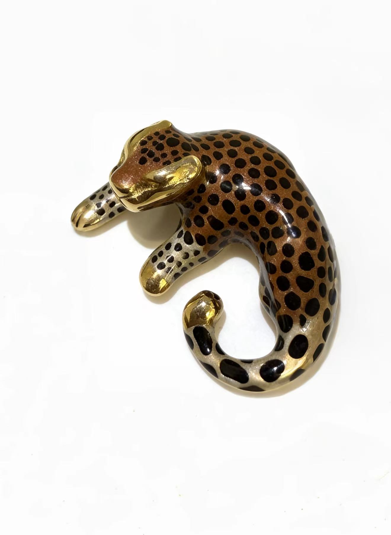 This 14K gold leopard pendant is a perfect fusion of wildness and luxury! Crafted with enamel cloisonné technique, it features classic leopard print textures, with brown and black color blocking recreating the cheetah’s vivid boldness. The contours outlined in 14K gold and gilded details on the finish lend the piece a three-dimensional and exquisite look. As a symbol of strength and luck, the cheetah motif paired with the warm luster of 14K gold makes this pendant not just a striking styling statement, but also a collectible jewelry piece with profound meaning.