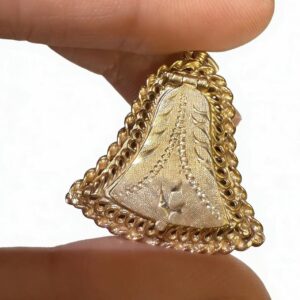 This exquisite 14K gold triangular filigree pendant marries vintage craftsmanship with architectural elegance, making it a distinctive addition to any jewelry collection. The pendant features a bold triangular silhouette, with a textured brushed 14K gold center that showcases a subtle, tactile finish and catches light with understated shimmer. Framing the central panel is an intricate handcrafted filigree border of polished 14K gold, with delicate woven metalwork creating an open, lace-like pattern that adds depth and artisanal charm— a hallmark of traditional goldsmithing techniques. The smooth, streamlined 14K gold bail ensures easy pairing with chains of varying thicknesses, while the pendant’s geometric shape offers a modern contrast to the ornate filigree detailing. Crafted from solid 14K gold for lasting durability and warm luster, this triangular pendant balances structural boldness with intricate detail, making it a versatile piece that transitions seamlessly from everyday wear to special occasions. Whether worn solo as a statement or layered with other gold pieces, it embodies timeless luxury and unique design.