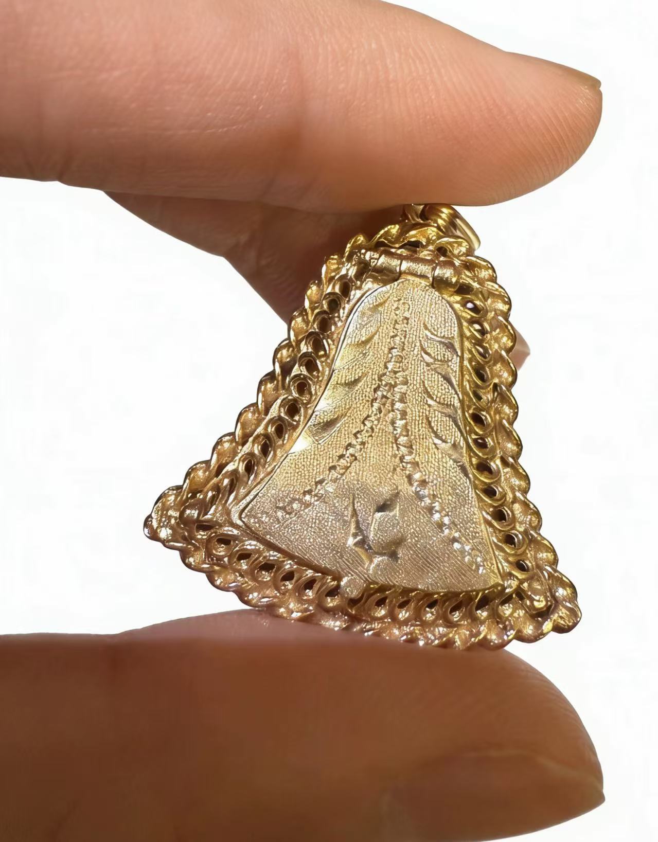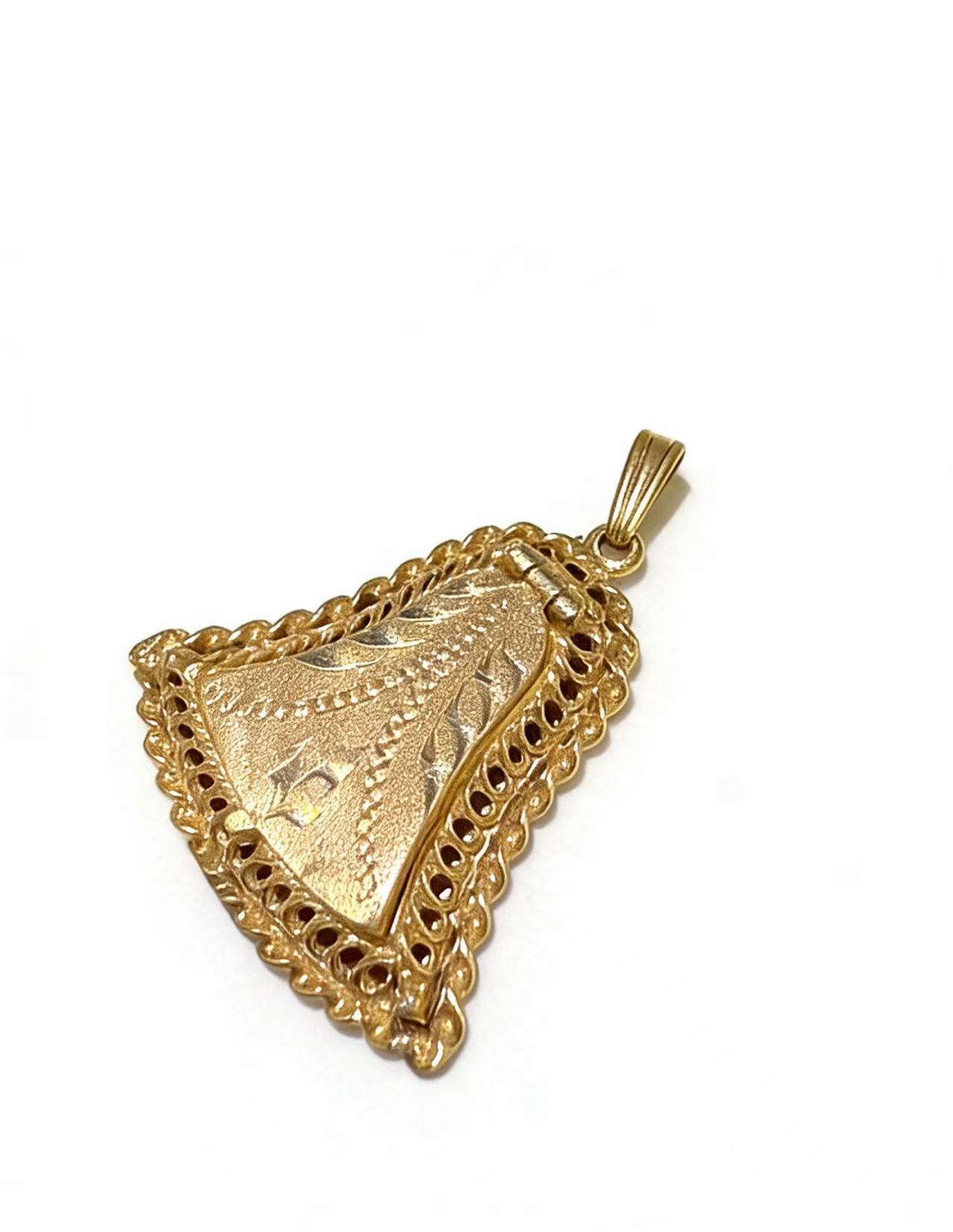 This exquisite 14K gold triangular filigree pendant marries vintage craftsmanship with architectural elegance, making it a distinctive addition to any jewelry collection. The pendant features a bold triangular silhouette, with a textured brushed 14K gold center that showcases a subtle, tactile finish and catches light with understated shimmer.