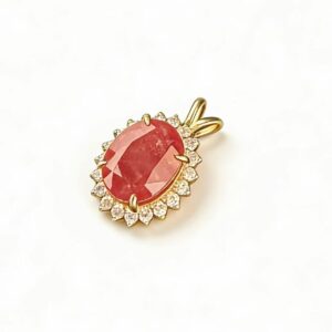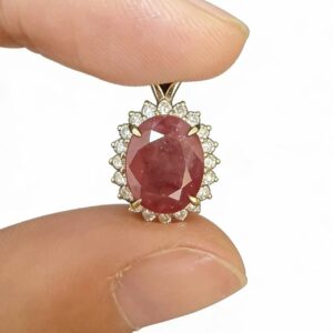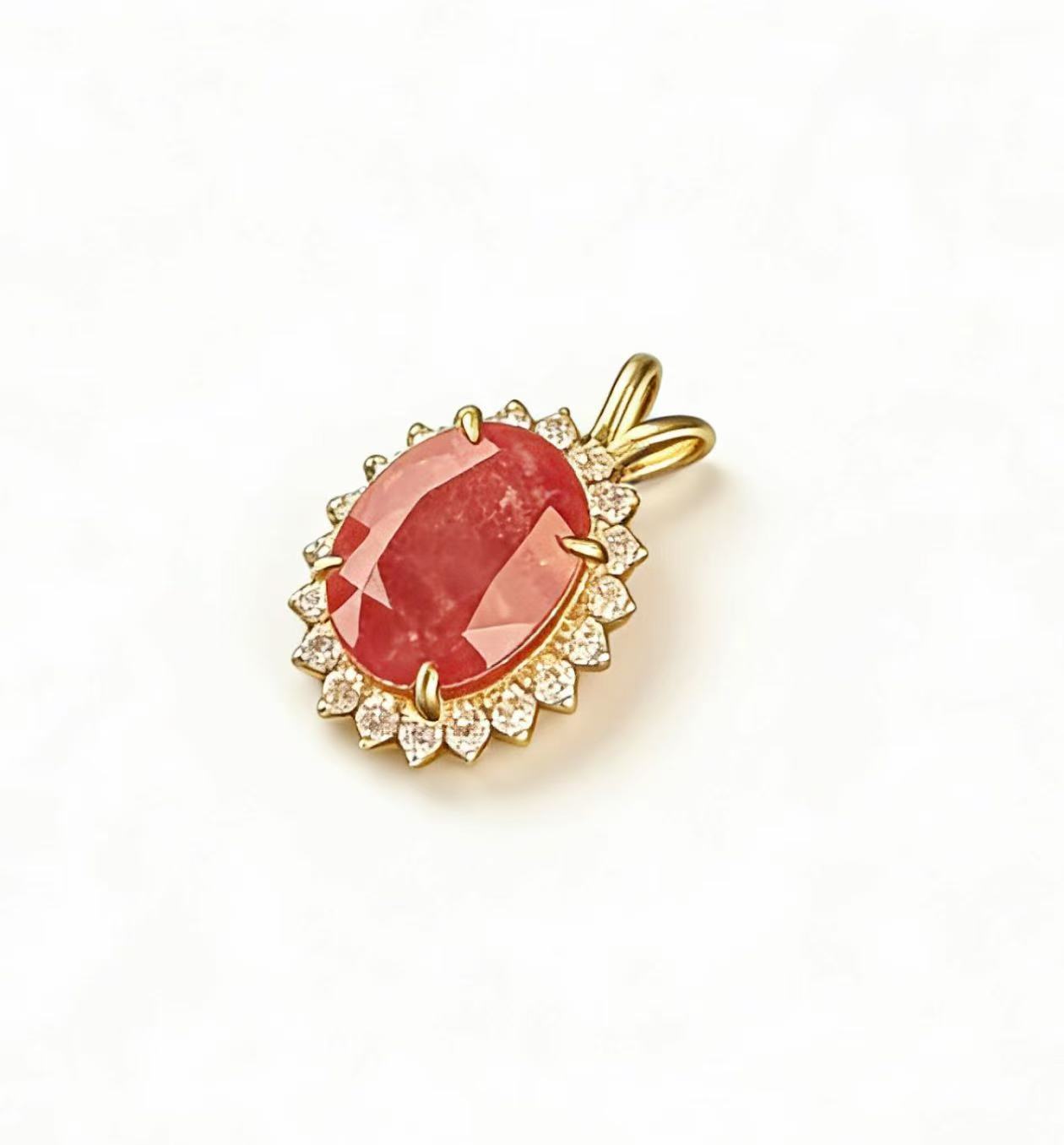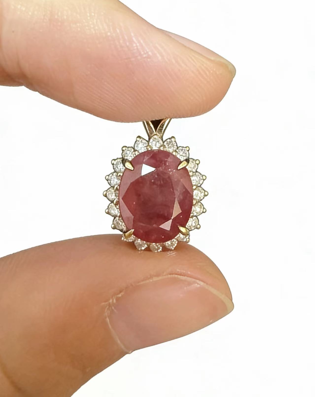 This 14K yellow gold ruby and diamond pendant embodies timeless elegance with its classic halo design and meticulous gemstone craftsmanship. At the heart of the piece sits a large oval-cut natural ruby in a rich, saturated red hue; the oval faceting maximizes the stone’s color depth and light performance, creating a captivating focal point that exudes luxury.