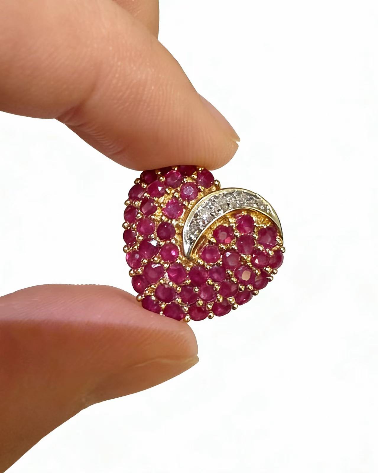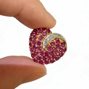 This romantic 14K gold heart pendant is a dazzling expression of luxury, featuring a pavé-set ruby heart and a sparkling diamond-accented curve for timeless elegance. The pendant’s iconic heart silhouette is entirely encrusted with round, vivid red rubies set in a micro-pavé 14K gold setting—each stone hand-selected for its rich hue and uniform cut, creating a seamless, velvety red surface that glows with depth. A sleek, polished 14K white gold curve sweeps across the heart’s upper edge, encrusted with brilliant-cut diamonds that contrast beautifully with the rubies and add a crisp, sparkling accent. The 14K gold construction ensures lasting durability and a warm, luminous finish, while the heart’s three-dimensional design adds tactile texture and visual interest from every angle.