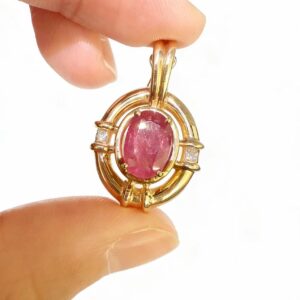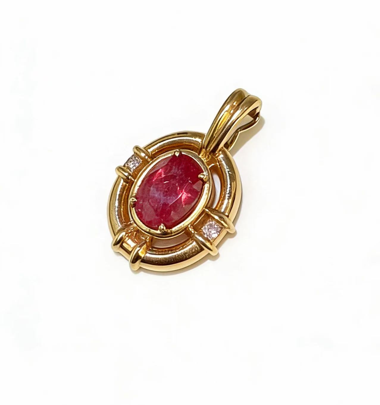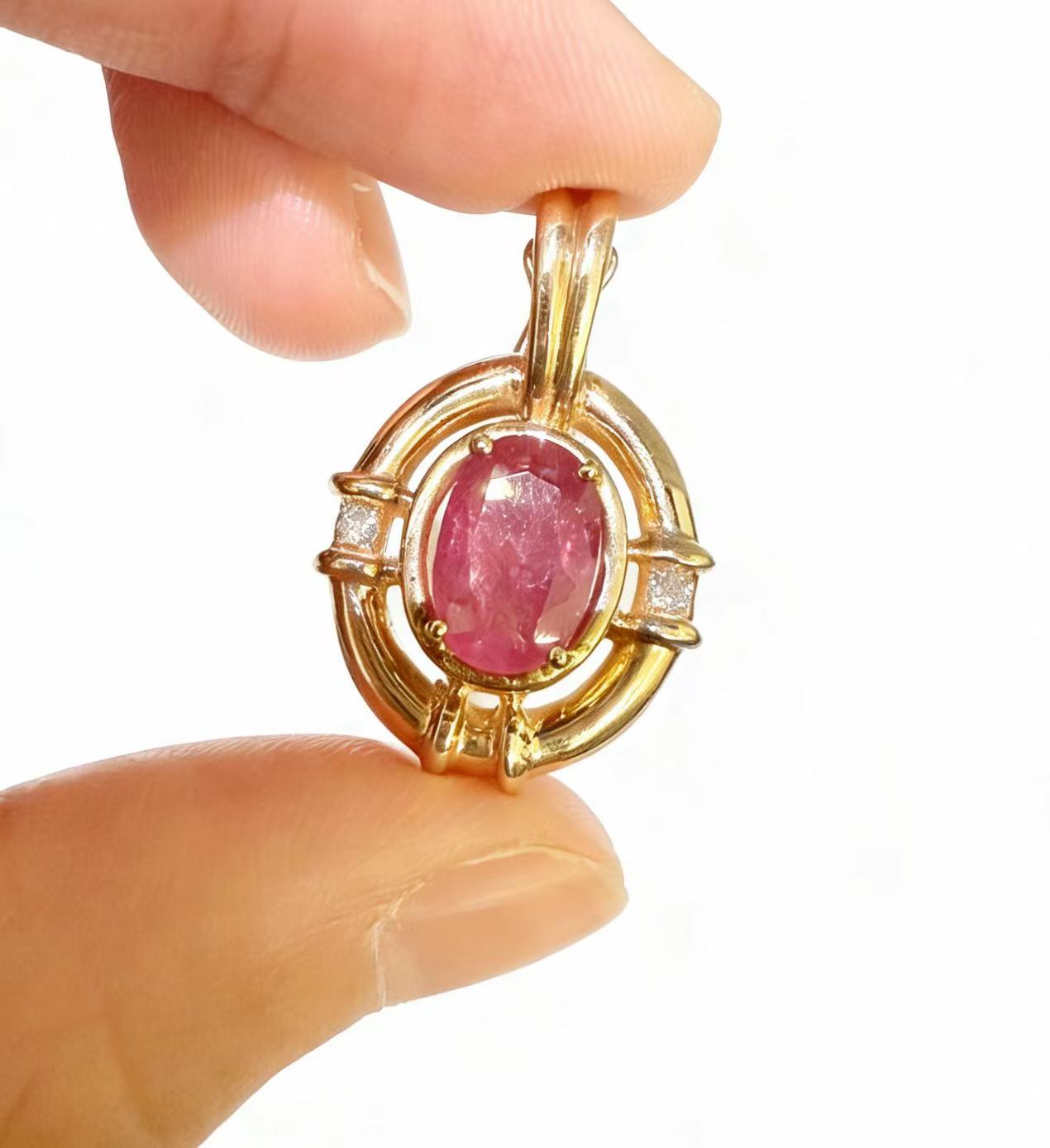 Crafted in polished 14k yellow gold, this striking pendant centers on a vibrant oval-cut ruby, showcasing rich magenta-pink hues with natural internal veining that lends the gemstone unique character. The ruby is held in a sleek four-prong setting, framed by a contemporary openwork gold halo with geometric angular accents—this modern design creates negative space that enhances the ruby’s color and allows light to pass through, boosting its luminosity. Tiny round white diamond accents are set into the gold halo’s arms, adding subtle sparkle that complements the ruby’s bold tone without overshadowing it. A smooth, integrated 14k gold bail sits atop the halo, designed for effortless pairing with any chain and balanced to hang perfectly against the neck. The pendant blends classic gemstone luxury with mid-century modern design cues: the clean lines of the openwork setting contrast with the ruby’s organic color variation, while the 14k gold’s warm finish amplifies the gem’s pinkish-red undertones. Meticulously crafted from solid 14k gold, this piece is a timeless yet contemporary addition to fine jewelry collections, ideal for everyday wear or as a statement of personal style.
