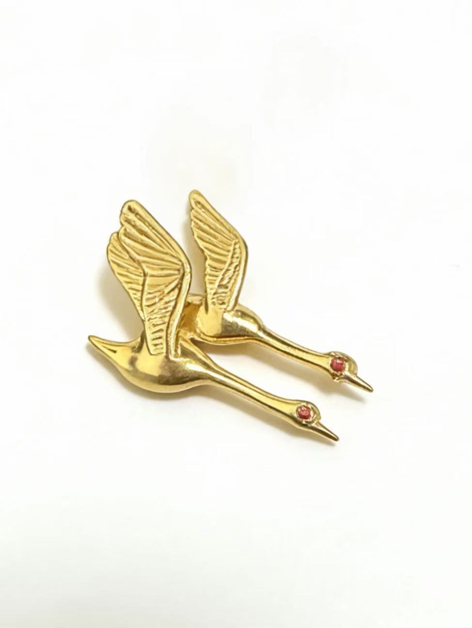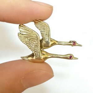 Each crane’s beak is set with a tiny round-cut ruby in a vivid red hue, serving as a striking pop of color against the warm gold; the rubies are held in minimal prongs that blend seamlessly into the crane’s design, adding a touch of luxury without overwhelming the organic bird motif. The pendant’s asymmetrical, dynamic composition—with the cranes angled in mid-flight—creates a sense of movement, making it a captivating focal point when worn.