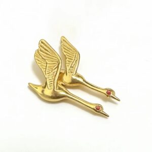 Each crane’s beak is set with a tiny round-cut ruby in a vivid red hue, serving as a striking pop of color against the warm gold; the rubies are held in minimal prongs that blend seamlessly into the crane’s design, adding a touch of luxury without overwhelming the organic bird motif. The pendant’s asymmetrical, dynamic composition—with the cranes angled in mid-flight—creates a sense of movement, making it a captivating focal point when worn.