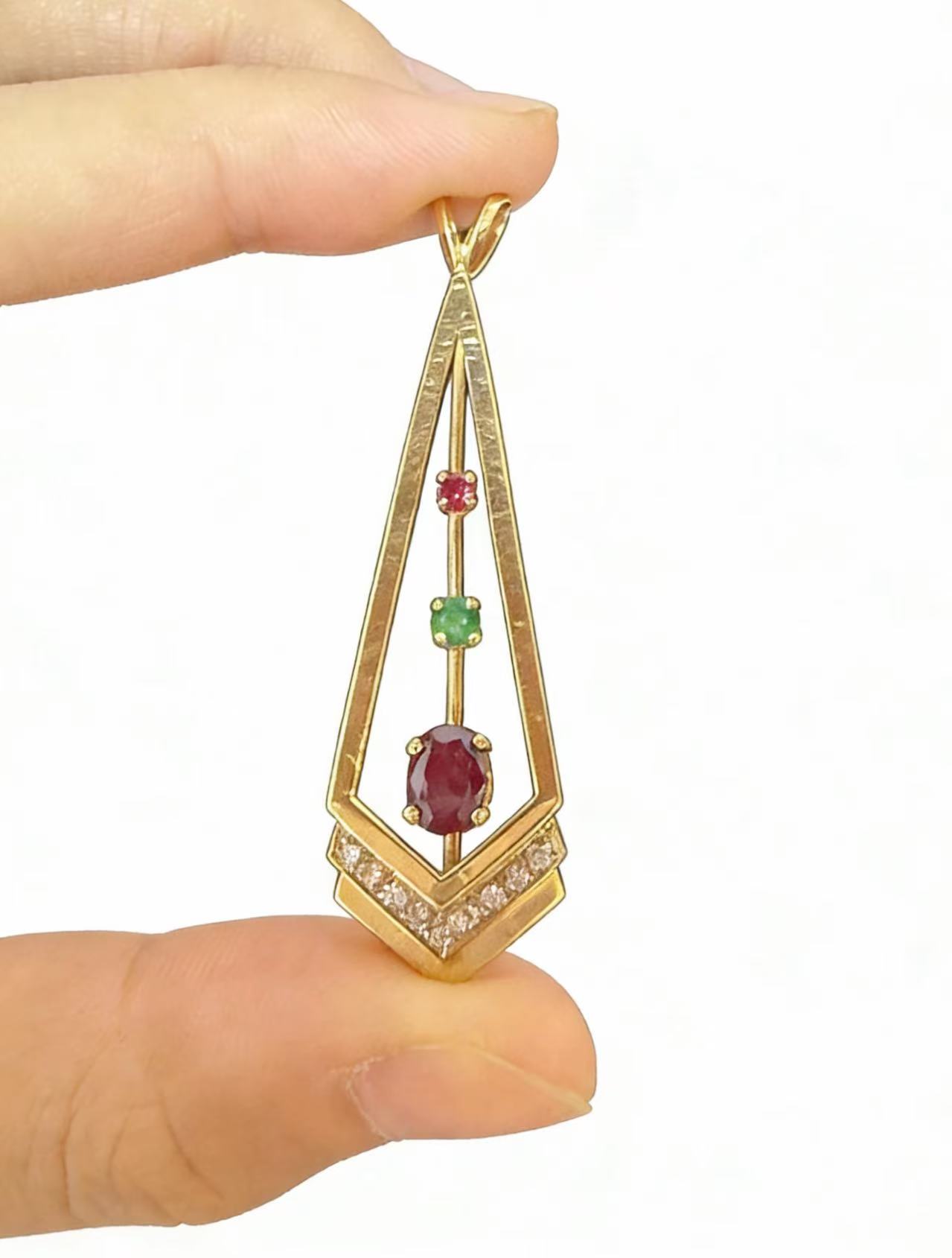 This striking pendant is masterfully crafted in polished 14K gold, boasting a bold Art Deco-inspired geometric tapered design that elongates the silhouette for a sophisticated look. At the heart of the angular frame, a curated arrangement of gemstones takes center stage: a vibrant round-cut ruby sits at the top, followed by a vivid emerald accent, and a prominent oval-cut ruby as the focal point—each gemstone is securely bezel-set to highlight its rich color saturation. The lower chevron section is encrusted with sparkling round brilliant-cut white topaz (or diamonds, per gemstone type) in a pave setting, adding a dazzling contrast to the warm 14K gold. The sleek, open-frame construction creates a lightweight feel while emphasizing the pendant’s modern yet timeless aesthetic, and the integrated bail ensures seamless pairing with any chain. Ideal for adding a pop of color and geometric flair to both formal and casual outfits, this pendant is a distinctive piece for collectors or a memorable gift for someone special.