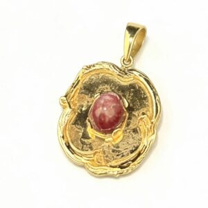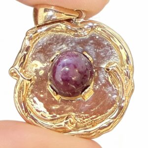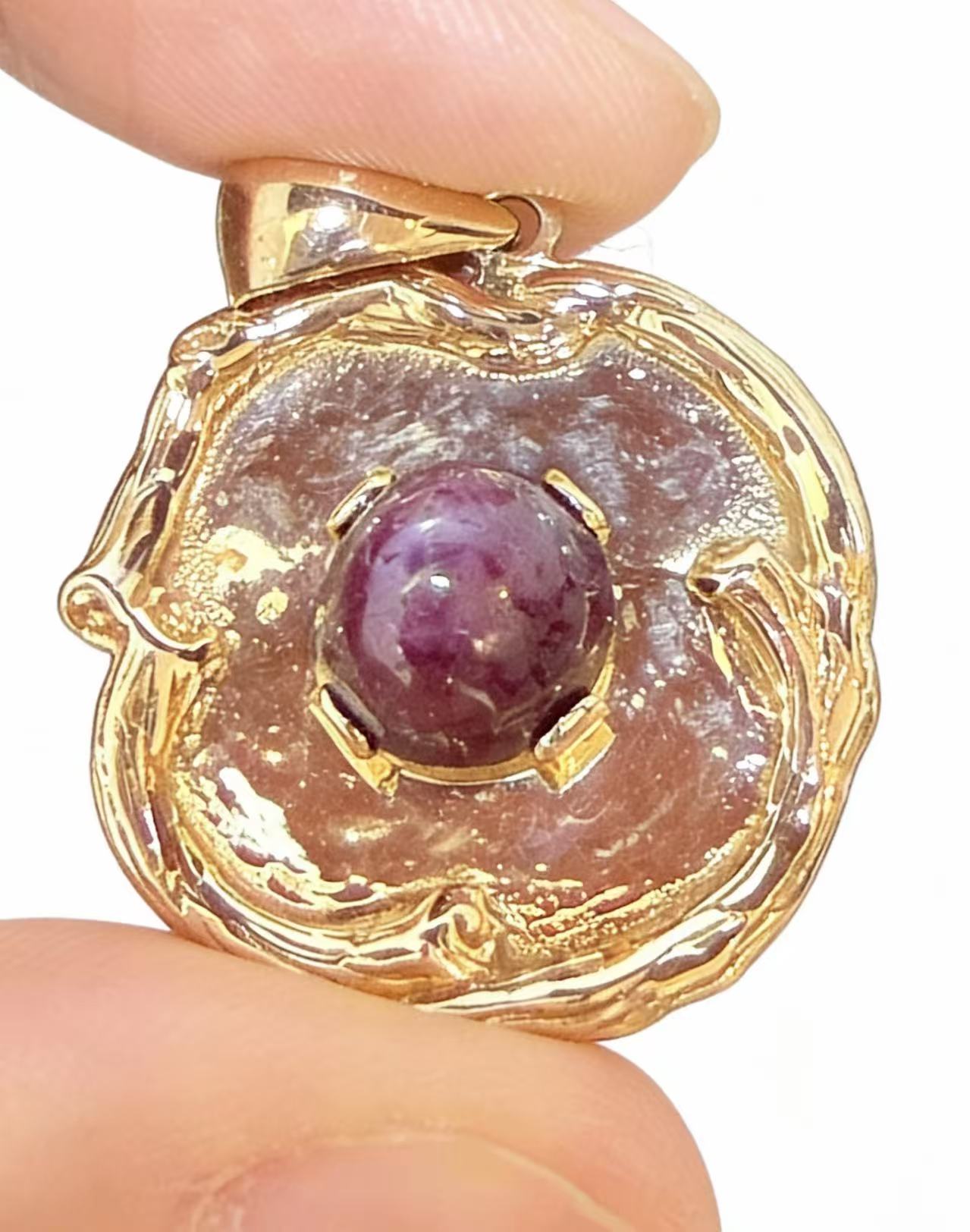 This artistic 14K gold ruby pendant redefines organic luxury with sculptural metalwork, featuring a cabochon-cut ruby set at the heart of a freeform, hand-hammered 14K gold frame. The rich crimson hue of the natural ruby contrasts dramatically against the warm, textured gold, which boasts an irregular, molten-like edge that mimics the fluidity of liquid metal—crafted to highlight artisanal, one-of-a-kind detail. The ruby’s smooth, uncut surface adds a raw, earthy element to the piece, while the polished 14K gold bail ensures easy pairing with any chain. Blending contemporary abstract design with the timeless allure of ruby, this pendant is a bold statement for jewelry collectors who appreciate handcrafted, non-traditional pieces. Its dimensional form and tactile texture make it a standout accessory for both casual and formal wear, embodying the perfect fusion of nature-inspired gemstone and avant-garde metal artistry.