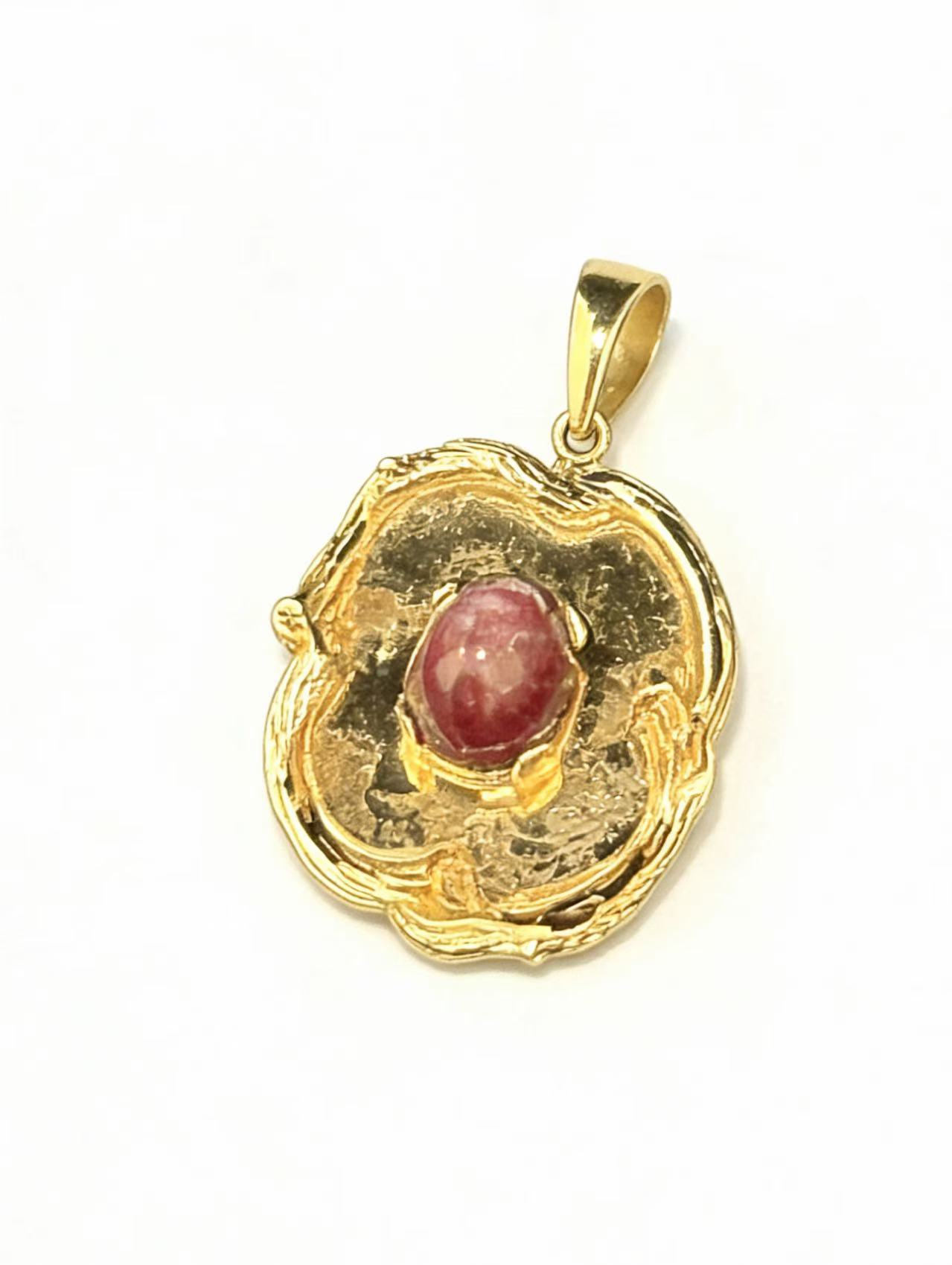 This artistic 14K gold ruby pendant redefines organic luxury with sculptural metalwork, featuring a cabochon-cut ruby set at the heart of a freeform, hand-hammered 14K gold frame. The rich crimson hue of the natural ruby contrasts dramatically against the warm, textured gold, which boasts an irregular, molten-like edge that mimics the fluidity of liquid metal—crafted to highlight artisanal, one-of-a-kind detail. The ruby’s smooth, uncut surface adds a raw, earthy element to the piece, while the polished 14K gold bail ensures easy pairing with any chain.