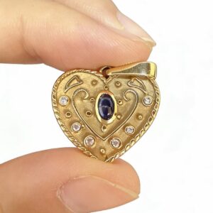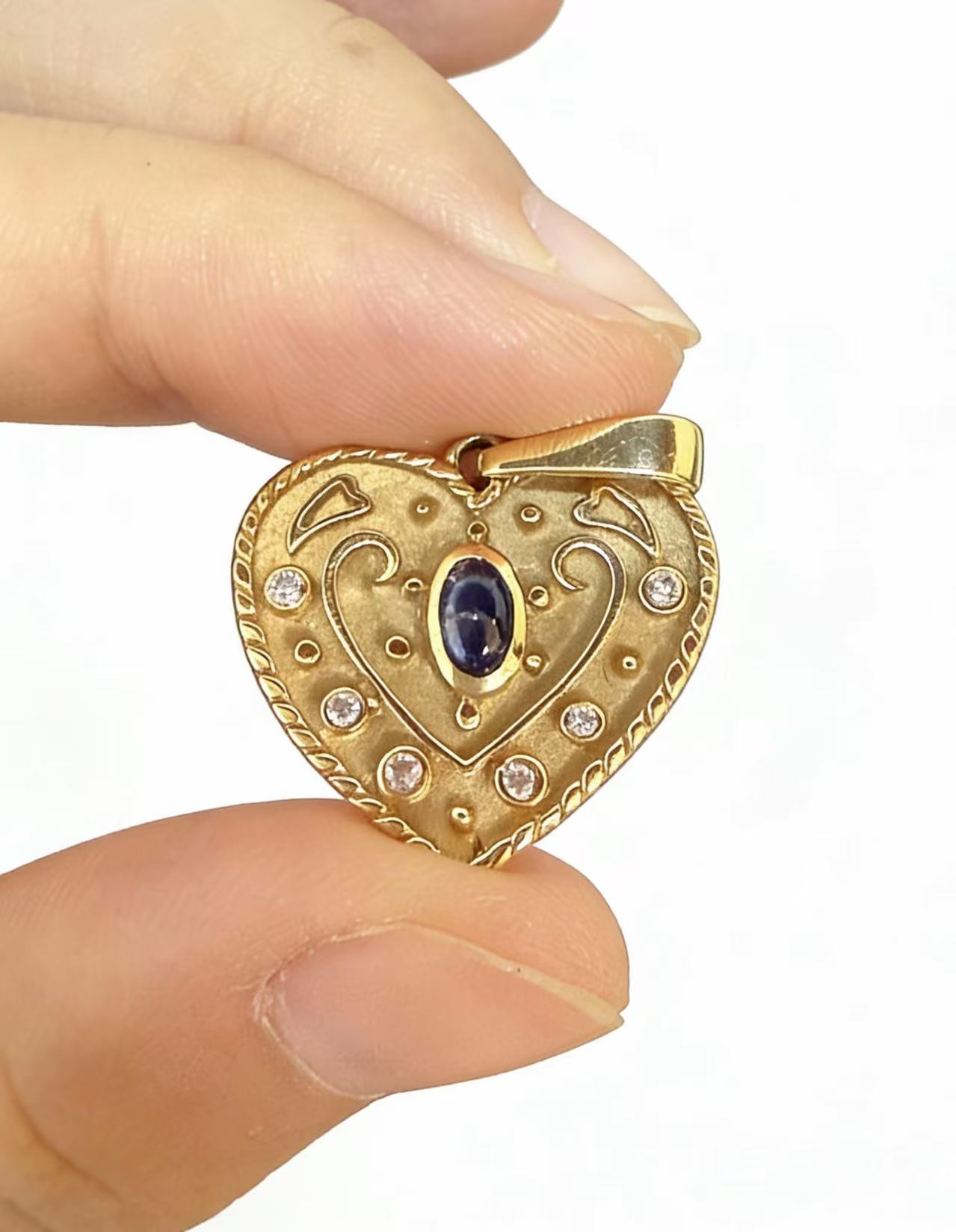 This romantic 14K gold heart pendant marries timeless symbolism with intricate craftsmanship, centering on a vivid marquise-cut sapphire set at the core of a sculpted heart silhouette. The deep royal blue of the sapphire contrasts strikingly against the warm 14K gold base, which features hand-engraved scrollwork detailing that adds vintage-inspired texture and depth. The heart’s border is encrusted with tiny round white topaz accents, their subtle sparkle framing the sapphire and catching light with every movement. Crafted with a polished 14K gold bail for seamless chain compatibility, the pendant blends a classic heart shape with artisanal metalwork—making it a heartfelt everyday piece or a meaningful gift for anniversaries, birthdays, or romantic gestures. Its compact size and delicate detailing ensure it transitions effortlessly from casual daytime wear to elegant evening looks, embodying both sentiment and refined design.