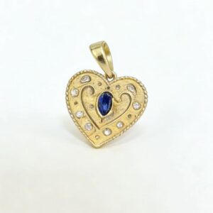 This romantic 14K gold heart pendant marries timeless symbolism with intricate craftsmanship, centering on a vivid marquise-cut sapphire set at the core of a sculpted heart silhouette. The deep royal blue of the sapphire contrasts strikingly against the warm 14K gold base, which features hand-engraved scrollwork detailing that adds vintage-inspired texture and depth. The heart’s border is encrusted with tiny round white topaz accents, their subtle sparkle framing the sapphire and catching light with every movement.