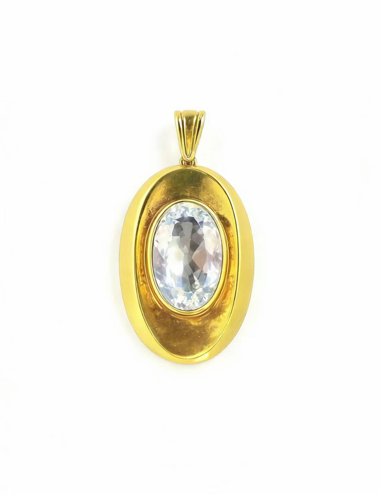 This elegant pendant is expertly crafted in polished 14K gold, featuring a sleek oval silhouette that embodies timeless minimalist design. At its center sits a large oval-cut white topaz, securely bezel-set in a smooth gold frame that accentuates the gemstone’s brilliant clarity and light refraction—each facet of the topaz catches light to create a captivating sparkle. The rounded, domed gold setting adds a subtle dimensionality and a soft, organic contrast to the crisp geometric cut of the topaz, while the streamlined bail ensures effortless pairing with any chain (from delicate gold chains to thicker statement styles).