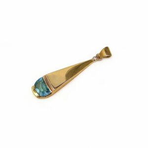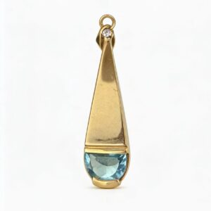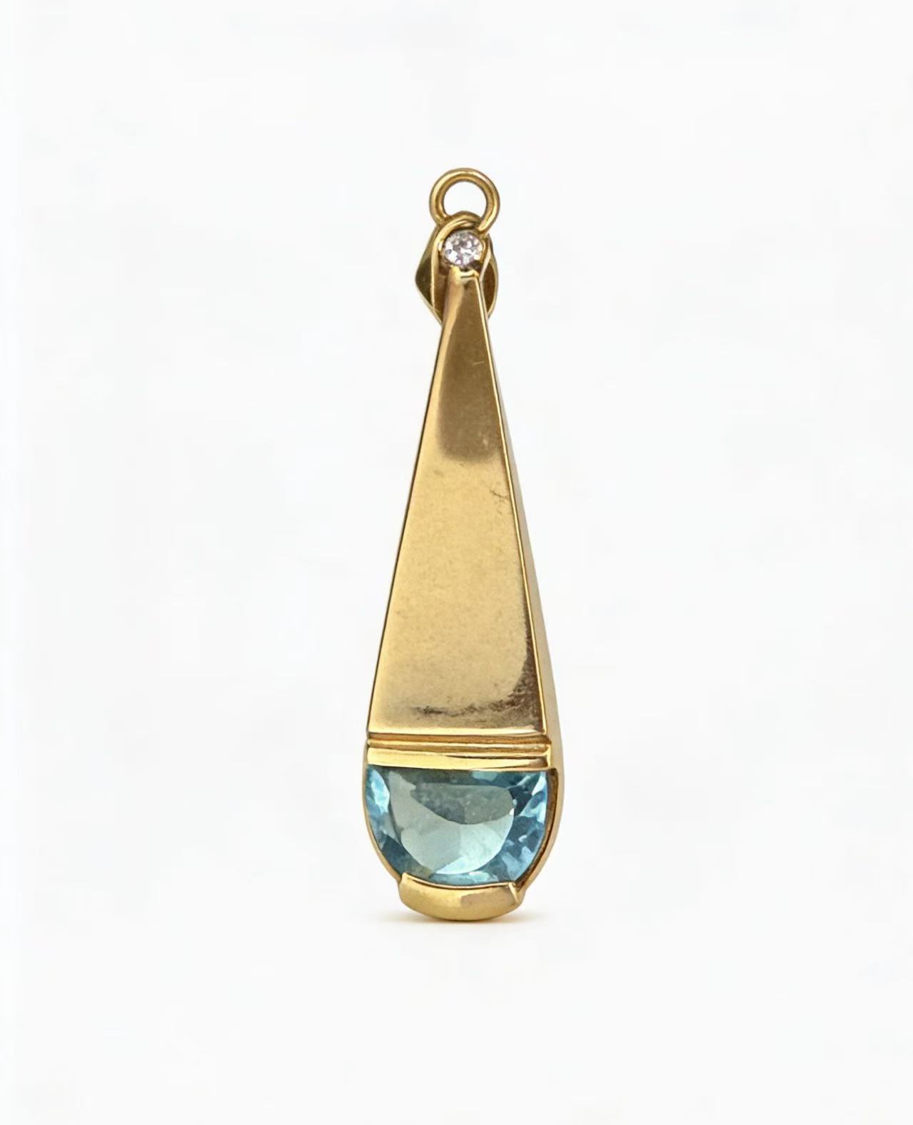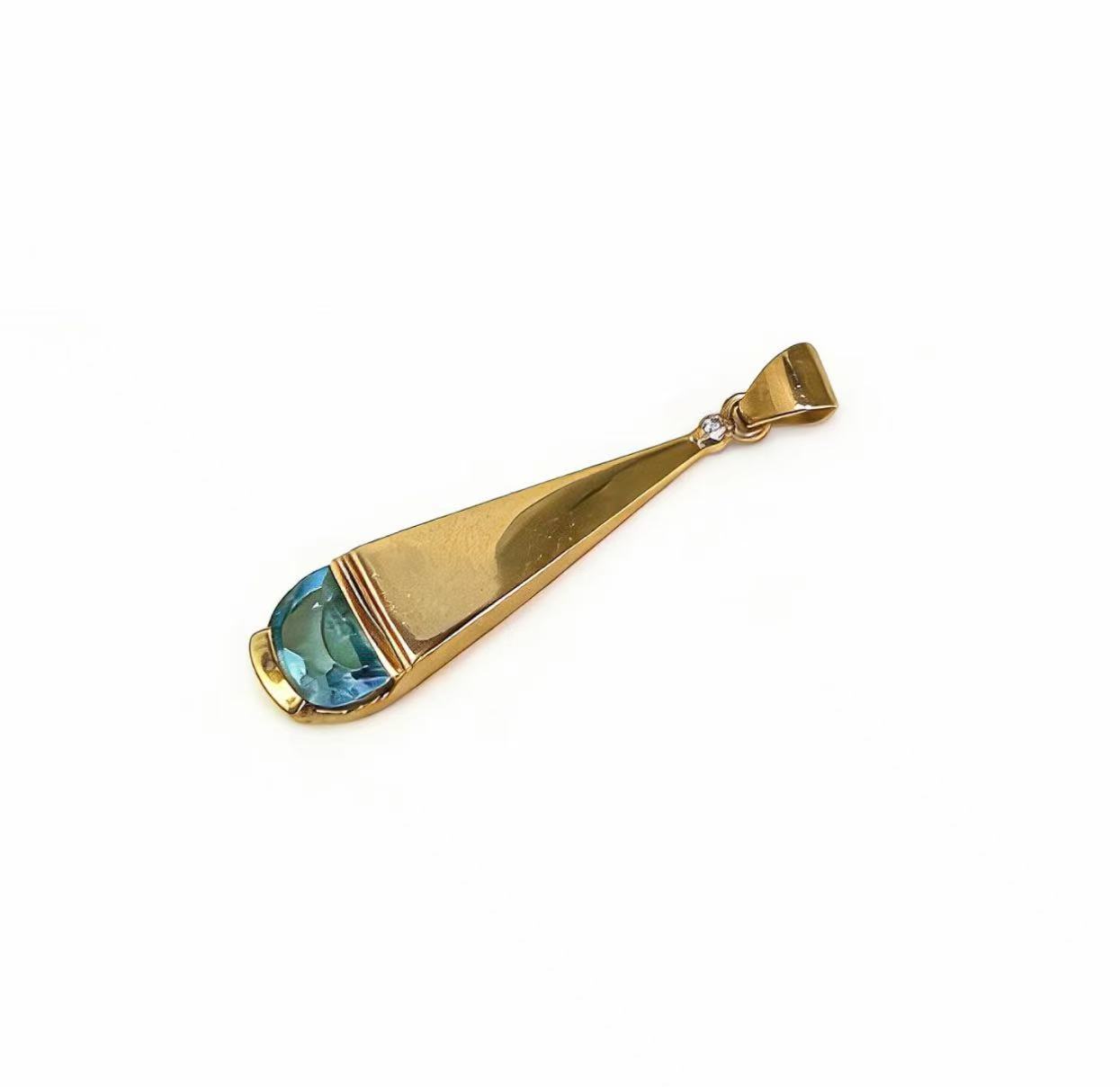 This 14K yellow gold blue topaz pendant redefines modern minimalism with its bold geometric silhouette and thoughtful design details. Crafted in polished 14K yellow gold, the pendant features a tapered, angular drop shape that narrows from a delicate bail to a striking base—this architectural form creates a sleek, elongated profile that flatters the neckline and draws the eye downward.