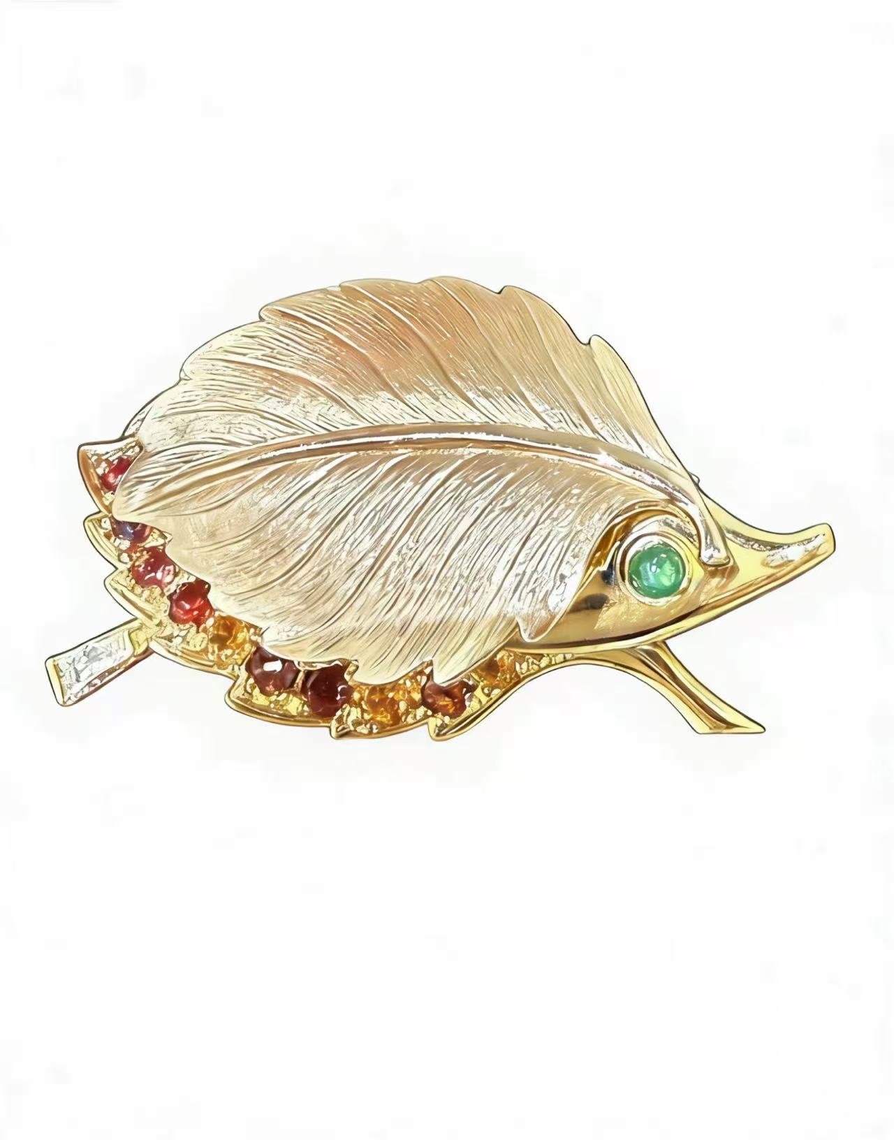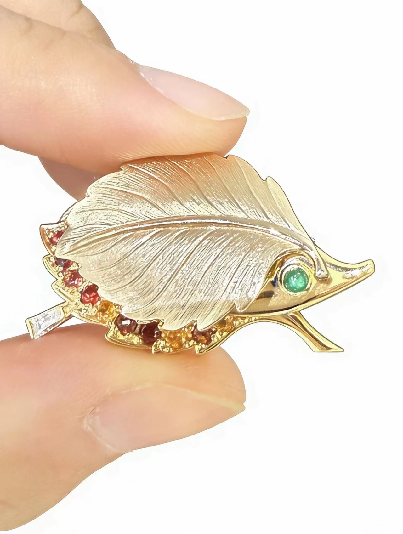 Crafted in solid 18K gold, this one-of-a-kind brooch showcases a masterful blend of feather and fish silhouettes—an emblem of imaginative jewelry design. The feather section boasts hand-engraved texture that mimics the softness of real plumage, while the fish’s head is highlighted by a bezel-set emerald cabochon for the eye and pavé-set red gemstones along the body for subtle sparkle. With its three-dimensional form and intricate metalwork, this brooch is not just an accessory but a wearable work of art, perfect for collectors of unique vintage jewelry.