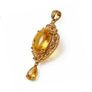 The center gem is framed by an intricate 18K gold border, adorned with hand-carved scrollwork and floral motifs that echo the opulence of 19th-century European jewelry. The pendant is finished with a detachable pear-cut citrine drop, which sways gently with movement to add a dynamic, eye-catching element.