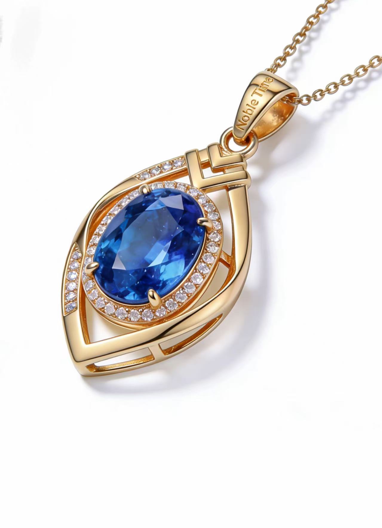 This pendant is a striking blend of modern geometric design and timeless luxury, crafted in warm 18K gold. At its center lies a vivid, oval-cut blue sapphire, embraced by a delicate halo of sparkling diamonds that amplify its depth and brilliance.