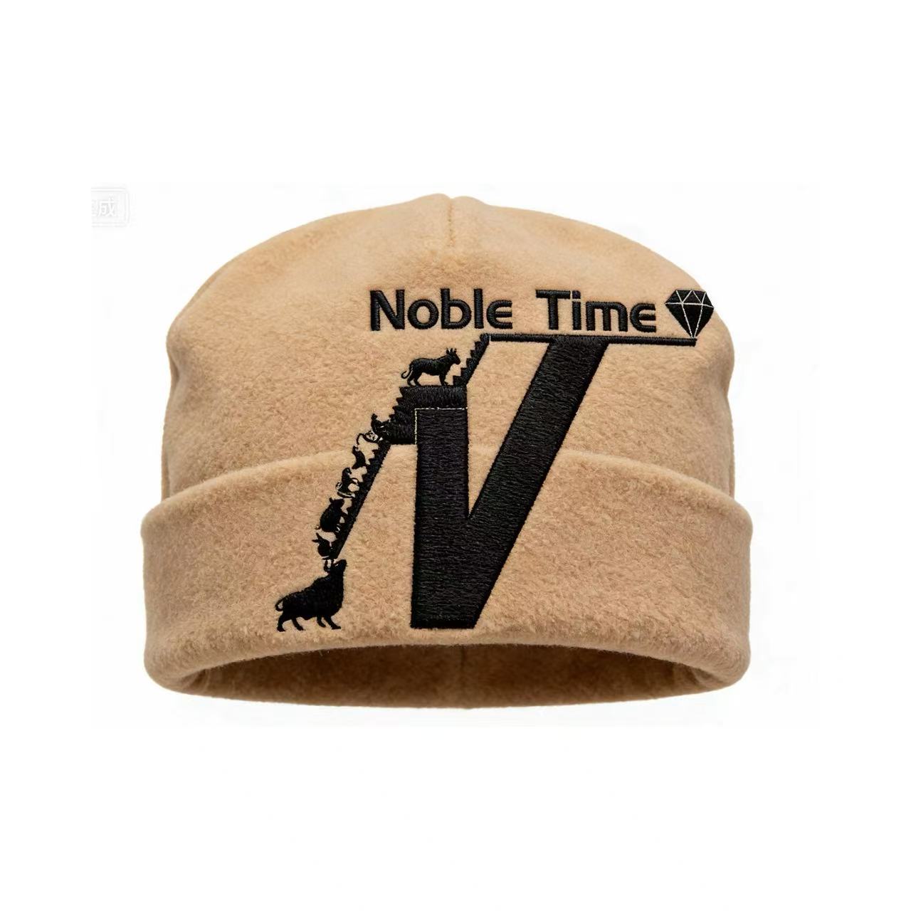 This khaki fleece-lined knit beanie marries functional warmth with artistic design sophistication. Crafted from a soft, thick knit fabric with a plush fleece interior, the beanie features a classic rolled cuff that enhances both fit and cold protection—this structured fold also serves as a perfect visual base for the prominent Noble Time logo. The logo is rendered in high-contrast black embroidery, with intricate stitching that captures every detail of the stylized “V” silhouette, animal motifs, diamond icon, and text; the embroidery’s raised texture adds a tactile layer of luxury, avoiding the flat look of printed graphics and seamlessly integrating with the knit fabric’s texture.