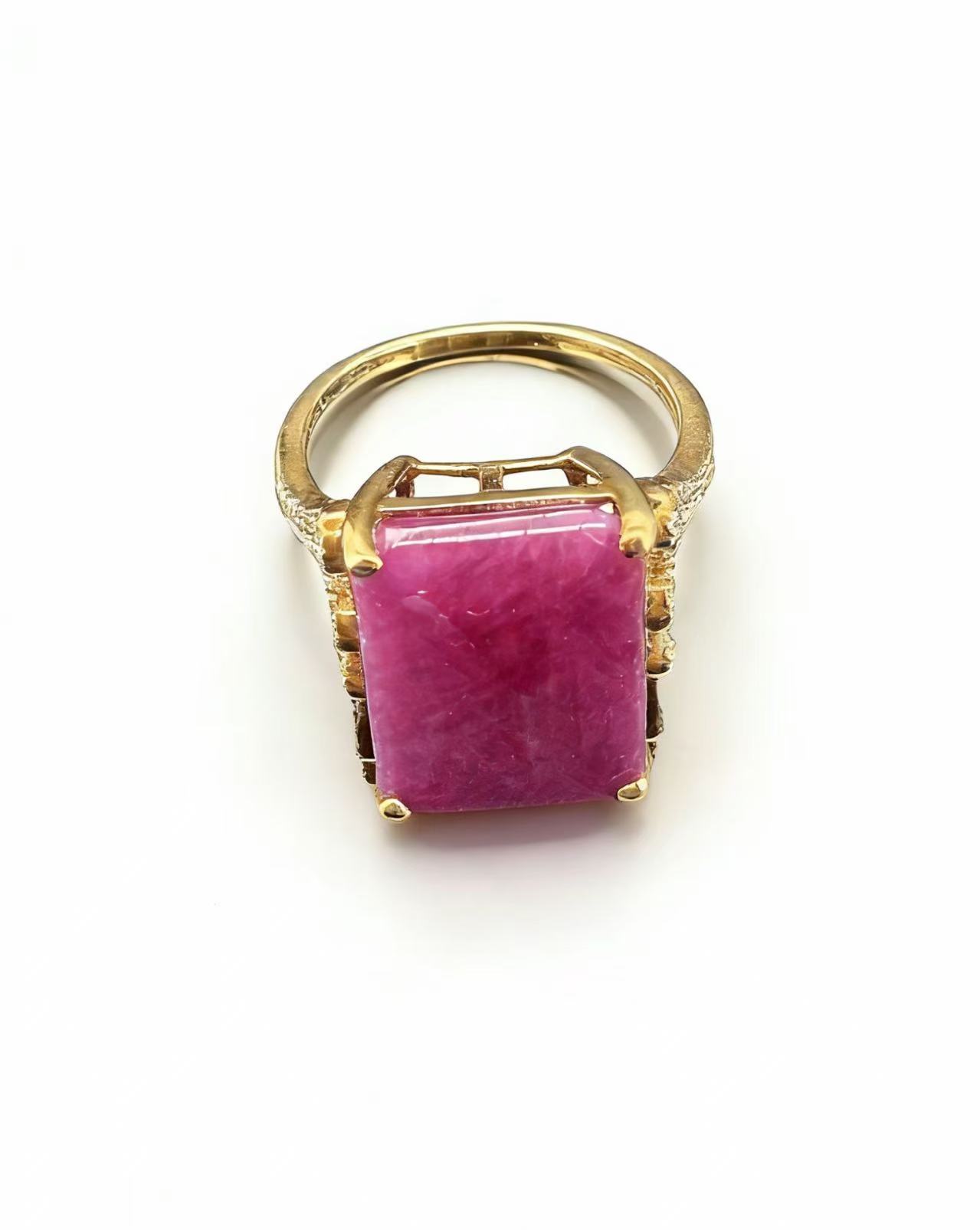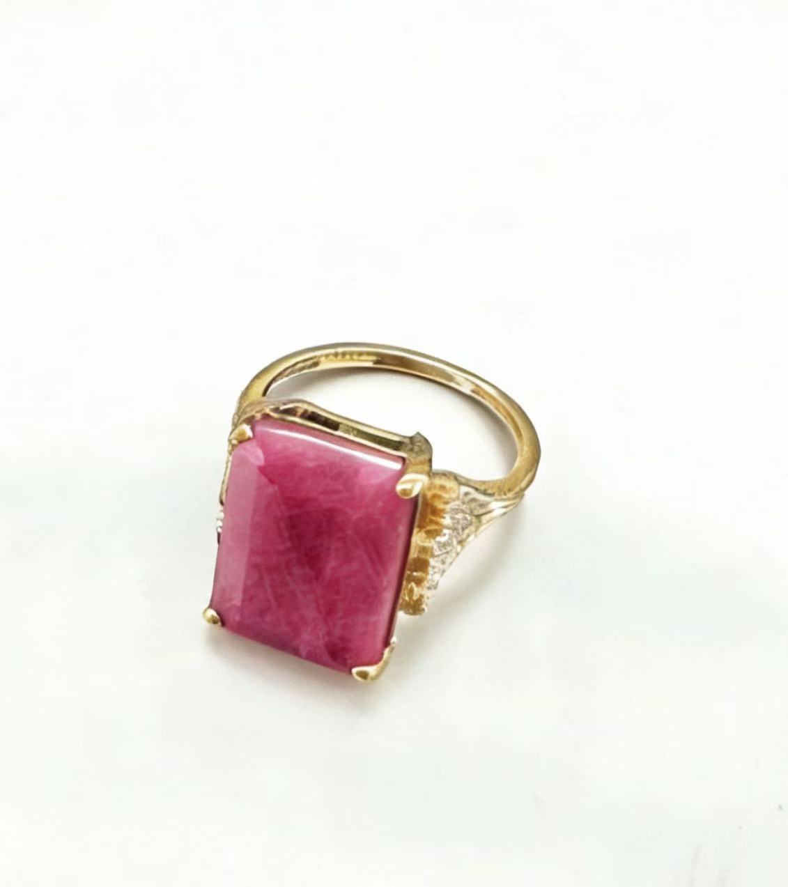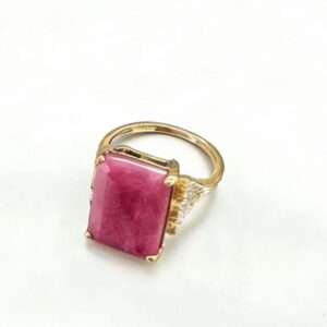 This 10K yellow gold ruby ring features a striking rectangular-cut natural ruby as the centerpiece, showcasing vivid magenta-pink hues with subtle internal veining that adds unique character to the gemstone. The bold bezel setting in polished 10K gold securely holds the ruby, while delicate gold prongs and intricate milgrain detailing on the band elevate the design with refined craftsmanship. The smooth, polished 10K gold band ensures a comfortable fit for everyday wear, blending timeless elegance with modern boldness. Ideal for those seeking a statement piece that marries the rich color of ruby with the warm luster of solid gold, this ring stands out as a versatile addition to both casual and formal jewelry collections.