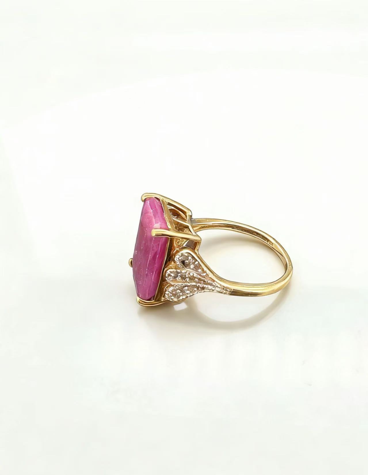 This 10K yellow gold ruby ring features a striking rectangular-cut natural ruby as the centerpiece, showcasing vivid magenta-pink hues with subtle internal veining that adds unique character to the gemstone.