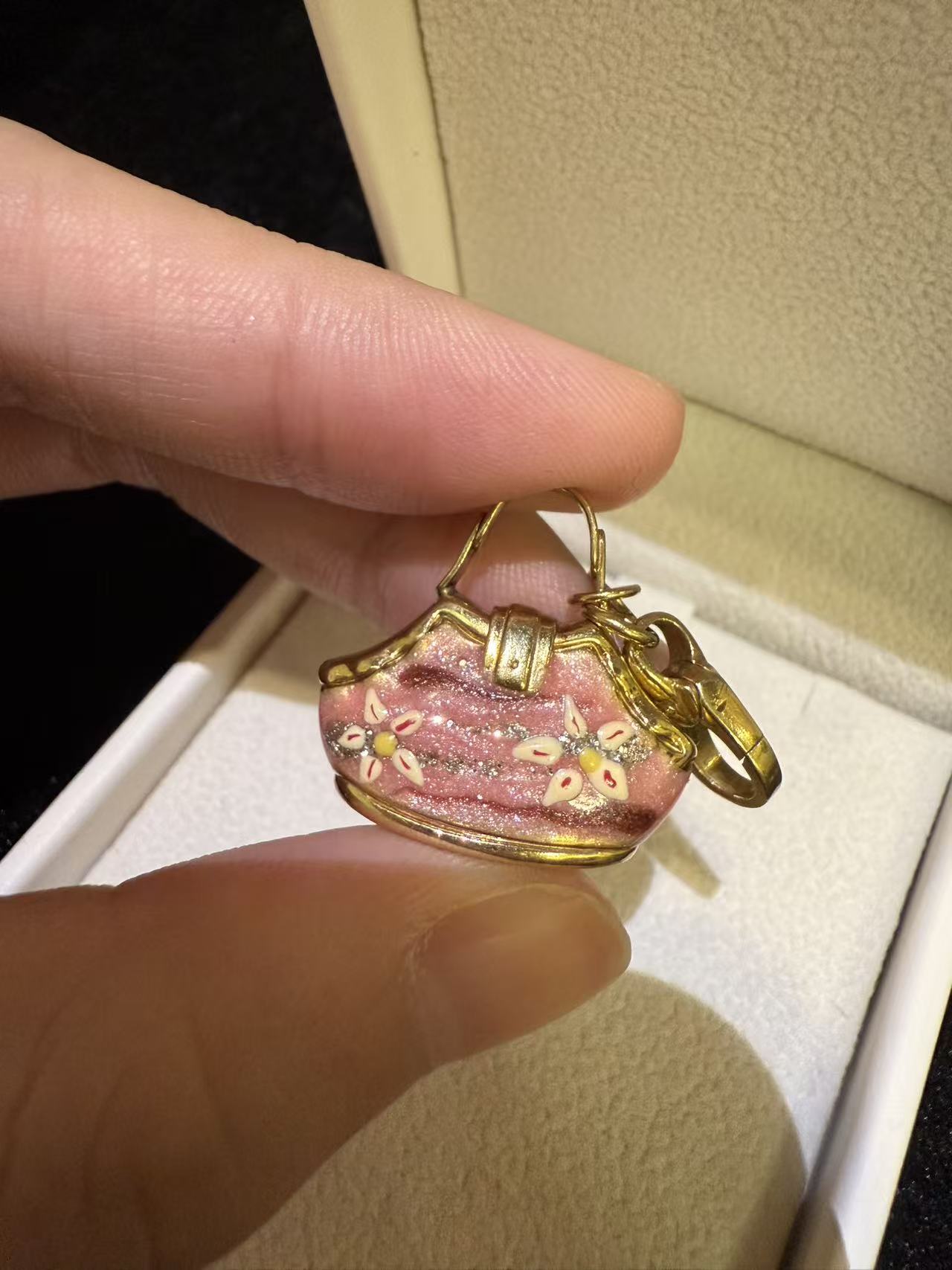 This charming 18k gold pendant reimagines the iconic handbag silhouette as a wearable work of art, blending luxury metalcraft with vibrant enamel artistry. The pendant’s body is adorned with hand-applied pink enamel infused with shimmering glitter, accented by delicate floral enamel inlays that add a whimsical, feminine touch—each enamel detail is fired at high temperatures for lasting color and luster, a hallmark of fine enamelwork.